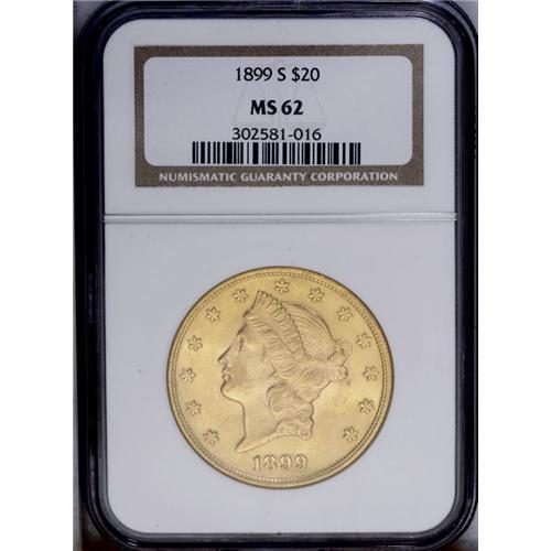 <B>1899-S $20 MS62 NGC.</B></I> A boldly struck Liberty double eagle with original color and prevalent luster. No heavy bagmarks are present on this conservatively graded specimen.