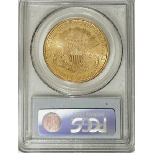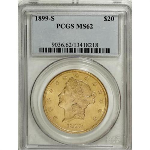 <B>1899-S $20 MS62 PCGS.</B></I> Flashy luster graces this well struck twenty. The reverse is splendidly preserved, and the obverse is attractive despite some brightness on the nose.<BR><BR><B>Coin Engraver:</B> James B. Longacre<BR><BR><b>Shipping:</b> Coins & Currency (<a target="_blank" href="http://www.heritageauctions.com/common/shipping.php">view shipping information</a>)