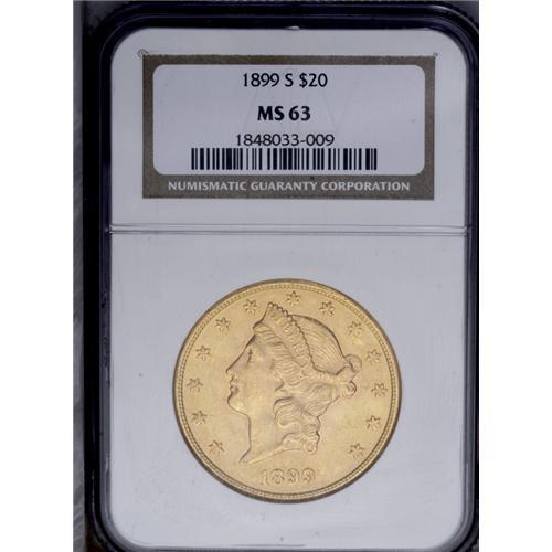 <B>1899-S<$20> MS63 NGC.</B></I> Sharply struck and highly attractive with rich yellow-gold color and traces of pinkish toning.