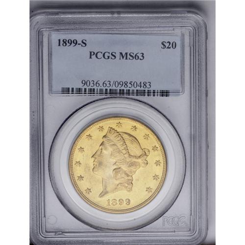 1899-S $20 MS63 PCGS. Crisply struck with dynamic, cor 1899-S[$20] MS63 PCGS.