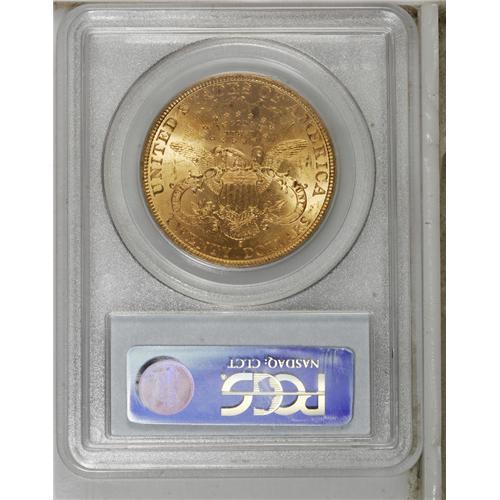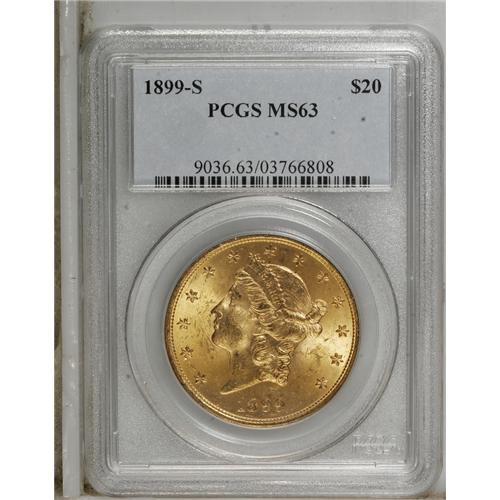 <B>1899-S $20 MS63 PCGS.</B></I> Rich honey-gold color is visible on both sides of this highly lustrous piece, with splashes of deep olive toning on the high points.<BR><BR><b>Shipping:</b> Coins & Currency (<a target="_blank" href="http://www.heritageauctions.com/common/shipping.php">view shipping information</a>)