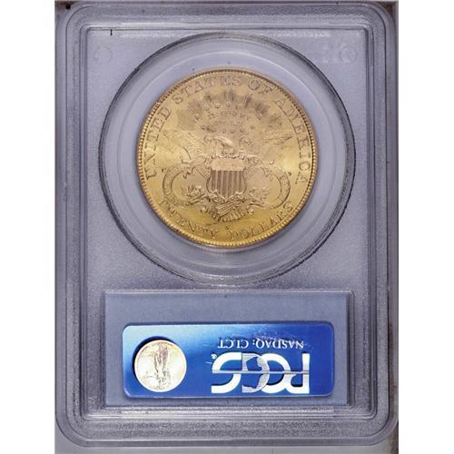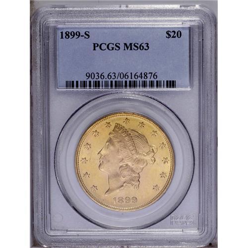 <B>1899-S<$20> MS63 PCGS.</B></I> Well struck with semi-prooflike fields and mild cloudiness on the obverse. Attractive green-gold and pink coloration, and few surface blemishes. <BR><BR><B>Important notice:</B> Heritage usually auctions material at the rate of 200-250 lots per hour. On some occasions eBay Live bid software or the Internet may not be able to keep up with the pace of the auction. We recommend placing a realistic absentee bid now as insurance to avoid disappointment. Occasionally the auctioneer may eliminate or reject an eBay Live bid, and the auctioneer may also reopen a lot after the close of the eBay live bidding (usually because we missed an audience bid), and may reject your bid even if it shows you as the winning bidder. By bidding via eBay Live, you agree that Heritage may award the lot to another bidder at its sole discretion under the circumstances described above or any other reasonable circumstances. Since eBay bids are not shown to us until we open the lot on the floor, we treat those bids just like floor bids. In most cases the floor responds before the eBay bid is presented to us, due to Internet lag time, so for consistency we have made it a policy that floor bids are always considered first over tie eBay live bids. Also please note that all Heritage lots purchased through eBay Live carry a 20% Buyer's Premium. Please make sure you read the Terms and Conditions before you bid. This lot is being auctioned in conjunction with a live floor auction by Heritage Galleries & Auctioneers. All final auction and invoice information will be supplied by Heritage Galleries & Auctioneers, and all other information should be considered preliminary. Lot:4390 <BR><BR><B>Winning Notification and Billing:</B> After the FINAL session in this auction is complete, Heritage will send e-mail and snail mail invoices. This process normally takes several days. All final auction and invoice information will be supplied by Heritage Galleries & Auctioneers, and all other information should be considered preliminary. <BR><BR>This auction will be conducted on a live auction floor and over the Internet through eBay Live. If you choose to place an absentee bid, please take a moment to <font color='#0000ff'><u><a href='http://pages.ebay.com/liveauctions/help/before/laabsentee.html'>learn how eBay Live absentee bidding works</a></u></font><font color='#000000'>