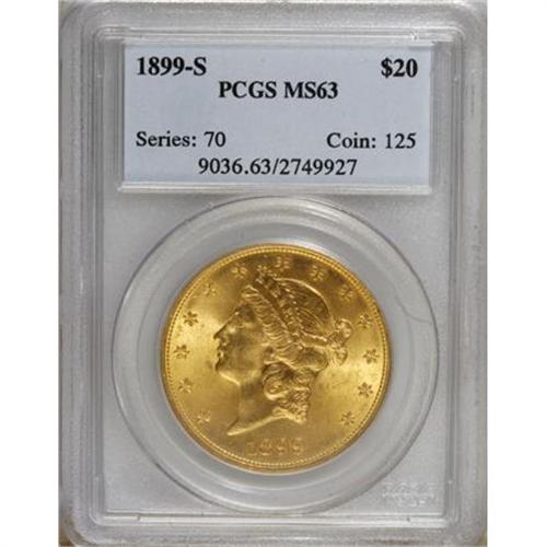 <B>1899-S $20 MS63 PCGS.</B></I> This piece looks finer than the assigned grade level would ordinarily imply. The intense luster and unusually vibrant lime-gold coloration are both unusually attractive. Well struck and minimally abraded, this is an outstanding Select Mint State double eagle. <BR><BR><b>Shipping:</b> Coins & Currency (<a target="_blank" href="http://www.heritageauctions.com/common/shipping.php">view shipping information</a>)