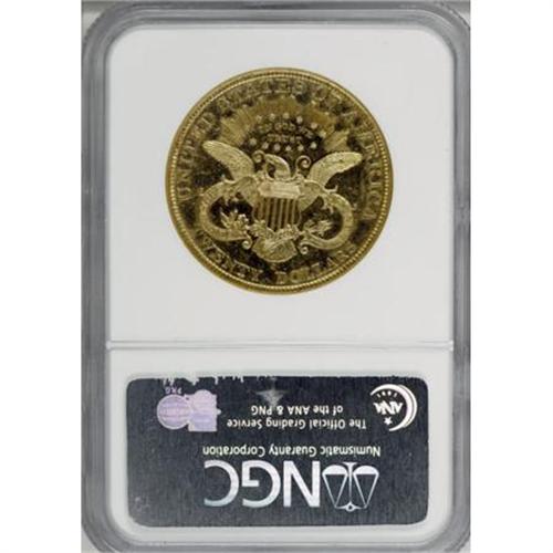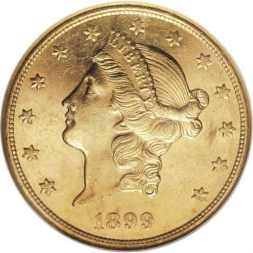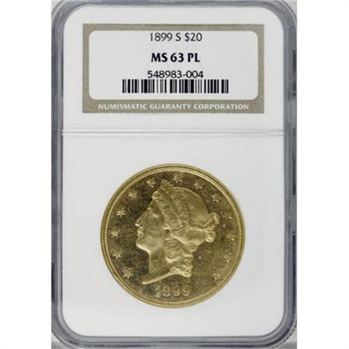 <B>1899-S $20 MS63 Prooflike NGC.</B></I> Impressively reflective fields confirm the Prooflike designation, and scarce as such despite a mintage of more than 2 million pieces. A boldly struck yellow-gold twenty with moderately abraded fields and an inconspicuous graze on the cheek. Census: 5 in 63 Prooflike, 2 finer (7/07).<BR><BR><B>Coin Engraver:</B> James B. Longacre<BR><BR><b>Shipping:</b> Coins & Currency (<a target="_blank" href="http://www.heritageauctions.com/common/shipping.php">view shipping information</a>)