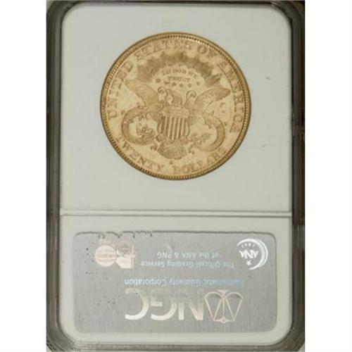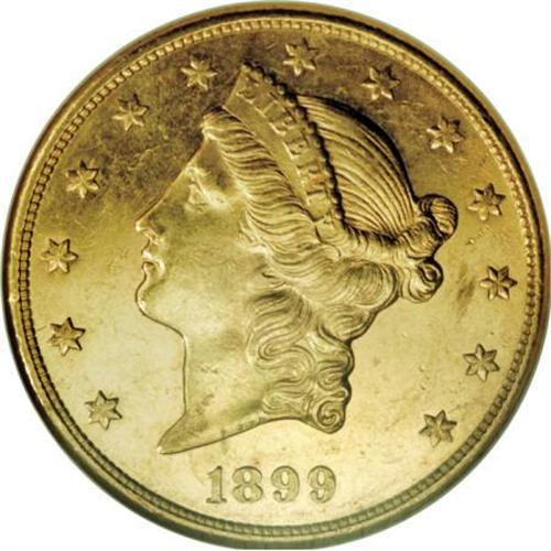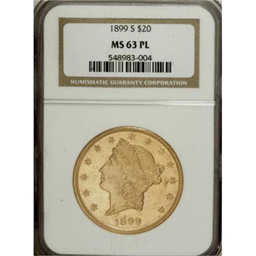<B>1899-S $20 MS63 Prooflike NGC.</B></I> Impressively reflective fields confirm the Prooflike designation, and scarce as such despite a mintage of more than 2 million pieces. A boldly struck yellow-gold twenty with moderately abraded fields and an inconspicuous graze on the cheek. Census: 5 in 63 Prooflike, 2 finer (7/07).<BR><BR><B>Coin Engraver:</B> James B. Longacre<BR><BR><b>Shipping:</b> Coins & Currency (<a target="_blank" href="http://www.heritageauctions.com/common/shipping.php">view shipping information</a>)