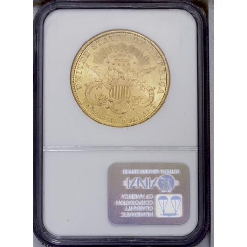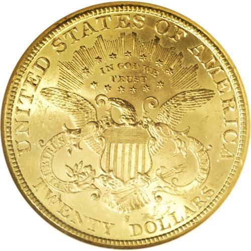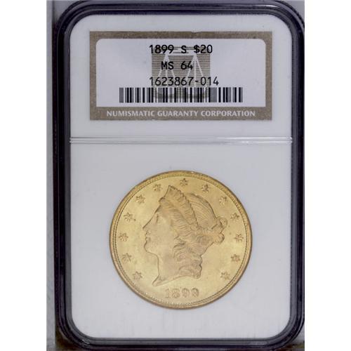 <B>1899-S<$20> MS64 NGC.</B></I> This coin shows a weak strike on some of the stars on the lower obverse, as is typical for the issue, but the pristine surfaces and phenomenal luster more than compensate. The color is a lovely copper-gold, and the central strike is well executed. This coin is scarce in MS64, and rare any finer. NGC has graded only nine pieces finer (3/06). <BR><BR><B>Important notice:</B> Heritage usually auctions material at the rate of 200-250 lots per hour. On some occasions eBay Live bid software or the Internet may not be able to keep up with the pace of the auction. We recommend placing a realistic absentee bid now as insurance to avoid disappointment. Occasionally the auctioneer may eliminate or reject an eBay Live bid, and the auctioneer may also reopen a lot after the close of the eBay live bidding (usually because we missed an audience bid), and may reject your bid even if it shows you as the winning bidder. By bidding via eBay Live, you agree that Heritage may award the lot to another bidder at its sole discretion under the circumstances described above or any other reasonable circumstances. Since eBay bids are not shown to us until we open the lot on the floor, we treat those bids just like floor bids. In most cases the floor responds before the eBay bid is presented to us, due to Internet lag time, so for consistency we have made it a policy that floor bids are always considered first over tie eBay live bids. Also please note that all Heritage lots purchased through eBay Live carry a 20% Buyer's Premium. Please make sure you read the Terms and Conditions before you bid. This lot is being auctioned in conjunction with a live floor auction by Heritage Galleries & Auctioneers. All final auction and invoice information will be supplied by Heritage Galleries & Auctioneers, and all other information should be considered preliminary. Lot:4393 <BR><BR><B>Winning Notification and Billing:</B> After the FINAL session in this auction is complete, Heritage will send e-mail and snail mail invoices. This process normally takes several days. All final auction and invoice information will be supplied by Heritage Galleries & Auctioneers, and all other information should be considered preliminary. <BR><BR>This auction will be conducted on a live auction floor and over the Internet through eBay Live. If you choose to place an absentee bid, please take a moment to <font color='#0000ff'><u><a href='http://pages.ebay.com/liveauctions/help/before/laabsentee.html'>learn how eBay Live absentee bidding works</a></u></font><font color='#000000'>