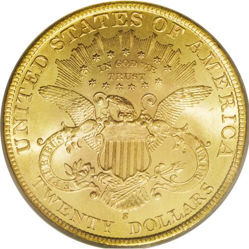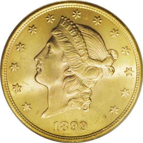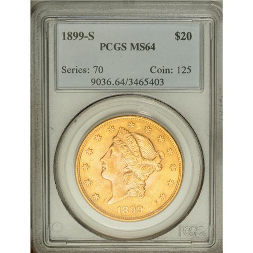 <B>1899-S $20 MS64 PCGS.</B></I> Very common in grades ranging from XF to MS63, this issue becomes scarce at the Choice Uncirculated level, and rare any finer. This near-Gem is well struck and boasts dynamic luster, along with eye-pleasing lime-gold and rose patina. Minor marks on Liberty's cheek and in the left obverse field prevent a higher grade.<BR><I>From The Kutasi Collection.</B></I><BR><BR><b>Shipping:</b> Coin/Currency (<a target="_blank" href="http://www.heritageauctions.com/common/shipping.php">view shipping information</a>)