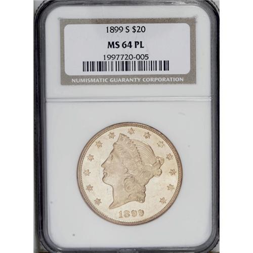 <B>1899-S<$20> MS64 Prooflike NGC.</B></I> An impressive near-Gem with canary-gold mirrored fields. The strike is exacting save for a few right-side obverse star centers. No marks require mention, and the overall appearance is smooth and attractive. A significant find for the Prooflike Liberty twenty collector. Census: 2 in 64 Prooflike, none finer (9/06).