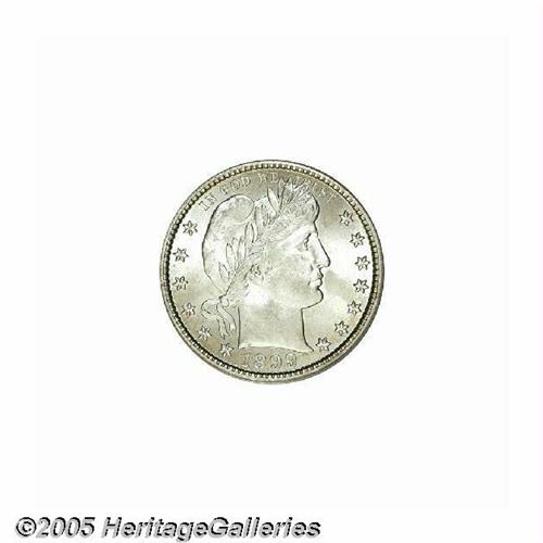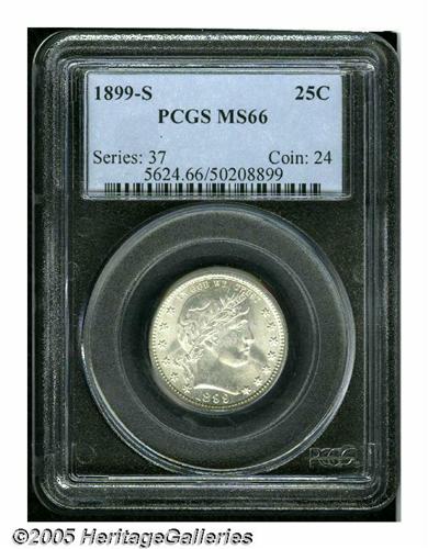 <B>1899-S<25C> MS66 PCGS.</B></I> Satiny-white with excellent sharpness over the liberally frosted devices and expectantly smooth surfaces. Whereas the 1899 has the highest mintage (12.6 million pieces) in the Barber quarter series, its S-mint counterpart was produced to the extent of only 708,000 pieces. Despite this limited original mintage, however, the 1899-S is occasionally found in better circulated grades after being repatriated from its newly won territory, the Philippines. Uncirculated examples are, however, quite a challenge to locate and Premium Gems such as this almost never surface. Population: 6 in 66, 2 finer (6/05).