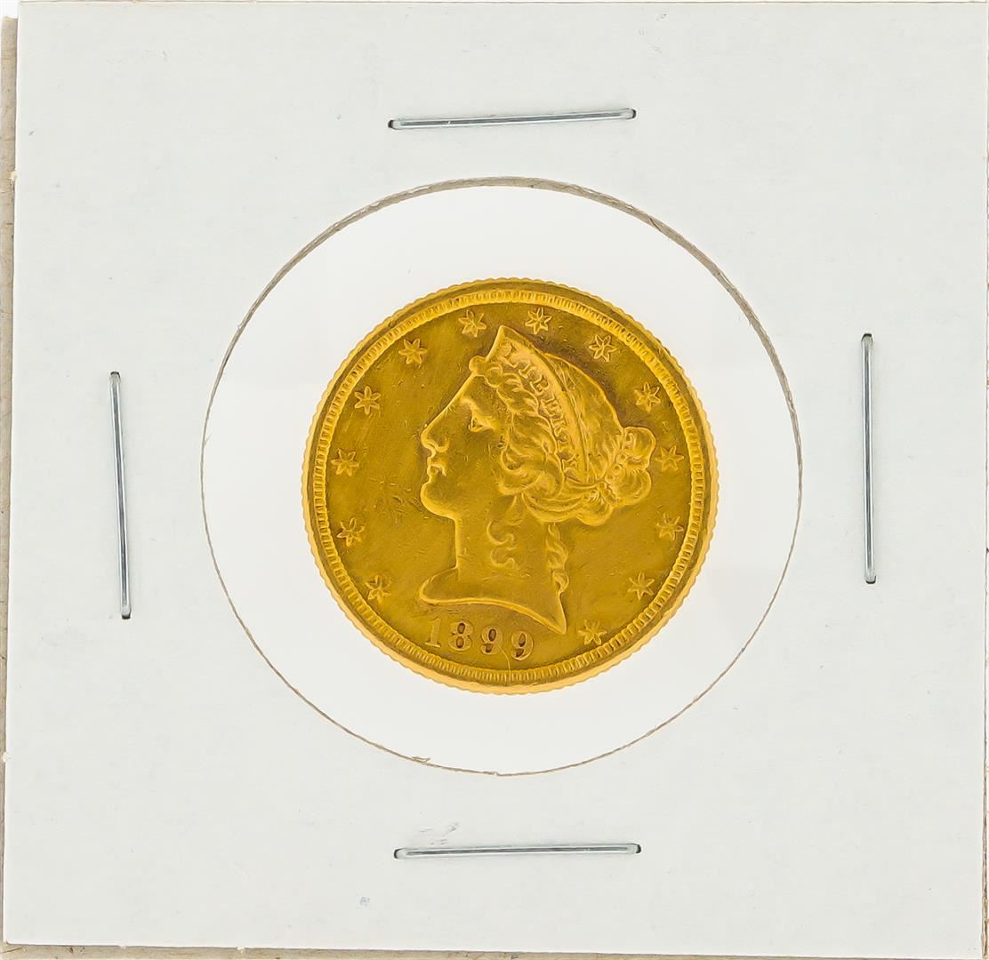 One 1899-S $5 Liberty Head Half Eagle Gold Coin.