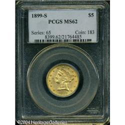 1899-S $5 MS62 PCGS. A good strike and undiminishe <B>1899-S $5 MS62 PCGS.</B></I> A good strike and undiminished luster combine with lightly marked fields for an attractive appearance for the grade. More than 1.5 million pieces were struck, yet this issue is noticeably scarce at the MS62 level. <BR><BR><B>Important notice:</B> Heritage usually auctions material at the rate of 200-250 lots per hour. On some occasions eBay Live bid software or the Internet may not be able to keep up with the pace of the auction. We recommend placing a realistic absentee bid now as insurance to avoid disappointment. Occasionally the auctioneer may eliminate or reject an eBay Live bid, and the auctioneer may also reopen a lot after the close of the eBay live bidding (usually because we missed an audience bid), and may reject your bid even if it shows you as the winning bidder. By bidding via eBay Live, you agree that Heritage may award the lot to another bidder at its sole discretion under the circumstances described above or any other reasonable circumstances. Since eBay bids are not shown to us until we open the lot on the floor, we treat those bids just like floor bids. In most cases the floor responds before the eBay bid is presented to us, due to Internet lag time, so for consistency we have made it a policy that floor bids are always considered first over tie eBay live bids. Also please note that all Heritage lots purchased through eBay Live carry a 20% Buyer's Premium. Please make sure you read the Terms and Conditions before you bid. This lot is being auctioned in conjunction with a live floor auction by Heritage Galleries & Auctioneers. All final auction and invoice information will be supplied by Heritage Galleries & Auctioneers, and all other information should be considered preliminary. Lot:6680