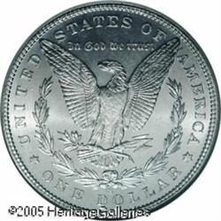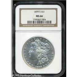 <B>1899-S<img border='0' src='http://www.heritagecoins.com/images/star.gif' width=10 height=10>$1 MS66 NGC.</B></I> The 1899-S is a curious issue. Not many examples remain in Uncirculated condition from the original mintage of 2.5 million pieces, but the ones that do remain are relatively high quality coins. This piece has exceptionally clean surfaces with the cheek of Liberty smooth and unblemished. The mint luster is bright and satiny with a fully bright, snow-white appearance seen over each side. Population: 20 in 66, 1 finer (1/05).<BR><I>From The Banks Collection.</B></I> Lot:10559