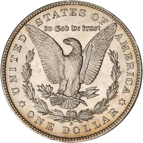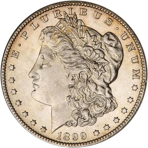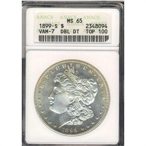 <b>1899-S Morgan Dollar. ANACS graded MS65 VAM-7, Double Date, Top 100.</b> Clear doubling on the date of this Top 100 variety. Unsurpassable in terms of surface preservation, both sides are satiny frosted to the point where they border on prooflike, the surfaces essentially tone-free. A little hint of gold at the rims. The devices were struck smack on the dot at the required force by the dies leaving all design elements plain and clear-cut, with not even an iota of weakness at the eagle's breast as found on some although the top two or three hair strands over Liberty's ear come together <b>(PCGS # 7262)</b>