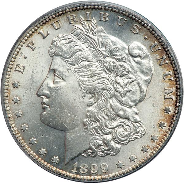 1899-S Morgan Dollar. PCGS graded MS-63. Attractive even toning around the edges, choice luster everywhere. Stored in an old Raymond folder (PCGS # 7262) .