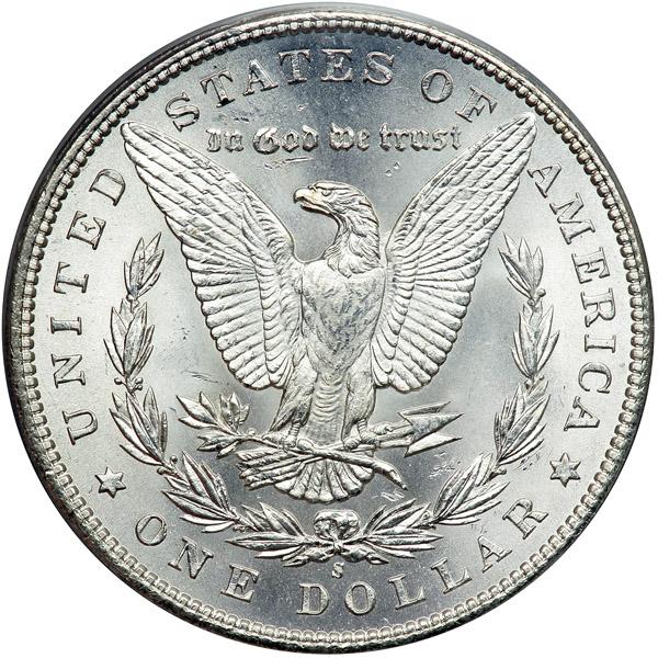 1899-S Morgan Dollar. PCGS graded MS-66. A blast white gem with near immaculate surfaces including the cheek and neck. This speaks well for the previous owners who obviously cared for it with the proverbial "kid gloves". The surface is outstanding! Pop 102, 1 in 66+, 8 in 67 (PCGS # 7262) .