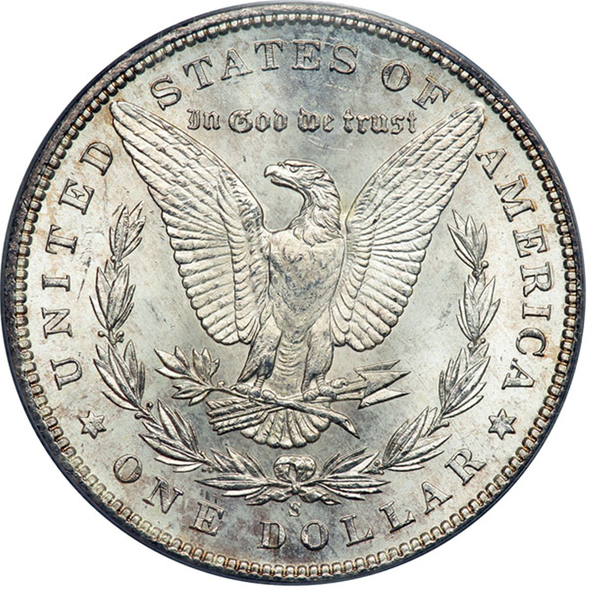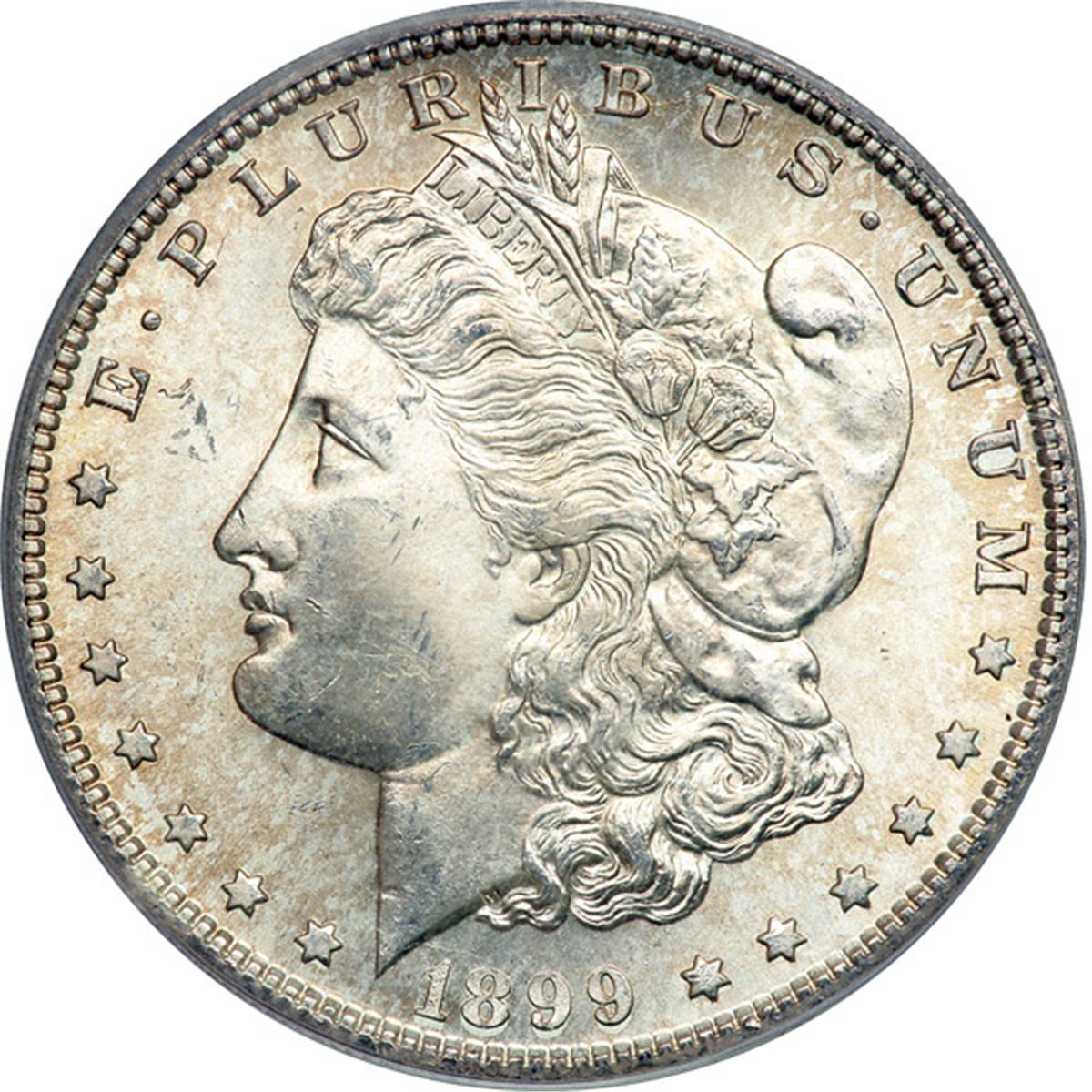 1899-S Morgan Dollar. PCGS graded MS-65. Light golden toning. Well struck and lustrous, the mint frost on Morgan dollars struck at San Francisco is almost always "showy" and vibrant on the best preserved specimens such as this MS65. The luster dances across the surface. When held in the hand and rotated, the coin displays the familiar cartwheel appearance (PCGS # 7262) .