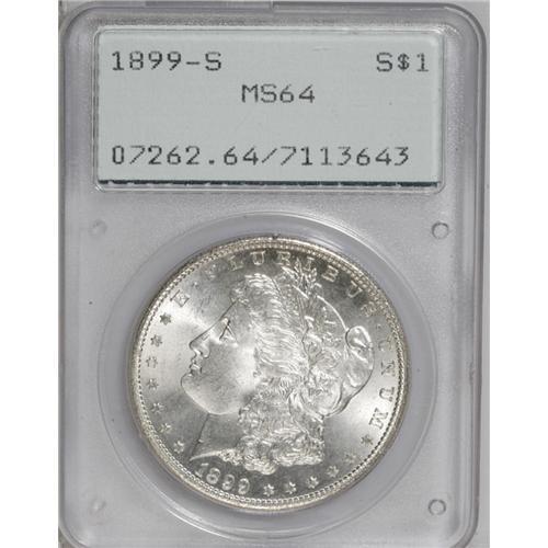<B>1899-S<img border='0' src='http://www.heritagecoins.com/images/star.gif' width=10 height=10>$1> MS64 PCGS.</B></I> Practically brilliant and boldly struck for this issue. Scattered marks and a series of parallel abrasions in the left reverse field limit the grade. Housed in an early holder.