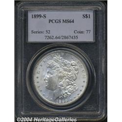 <B>1899-S<S$1> MS64 PCGS.</B></I> Very well struck for a '99-S and untoned, with shallow facial scuffs that are an obvious detriment to the coin's appeal and technical merit. <BR><BR><B>Important notice:</B> Heritage usually auctions material at the rate of 200-250 lots per hour. On some occasions eBay Live bid software or the Internet may not be able to keep up with the pace of the auction. We recommend placing a realistic absentee bid now as insurance to avoid disappointment. Occasionally the auctioneer may eliminate or reject an eBay Live bid, and the auctioneer may also reopen a lot after the close of the eBay live bidding (usually because we missed an audience bid), and may reject your bid even if it shows you as the winning bidder. By bidding via eBay Live, you agree that Heritage may award the lot to another bidder at its sole discretion under the circumstances described above or any other reasonable circumstances. Since eBay bids are not shown to us until we open the lot on the floor, we treat those bids just like floor bids. In most cases the floor responds before the eBay bid is presented to us, due to Internet lag time, so for consistency we have made it a policy that floor bids are always considered first over tie eBay live bids. Also please note that all Heritage lots purchased through eBay Live carry a 20% Buyer's Premium. Please make sure you read the Terms and Conditions before you bid.