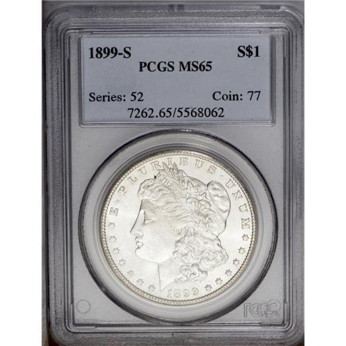 <B>1899-S<img border='0' src='http://www.heritagecoins.com/images/star.gif' width=10 height=10>$1 MS65 PCGS.</B></I> Highly lustrous with brilliant silver color and satiny surfaces. Sharply struck. This is a scarce date in Gem quality.