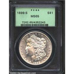 1899-S S$1 MS65 PCGS. Semi-prooflike fields with slight softness in the hair over Liberty's ear and a noticeable abrasion in the left obverse field. Important notice: We expect to be auctioning lots at the rate of 200-250 per hour. Sometimes eBay Premier live bid software cannot keep up with that pace, so we strongly recommend that you place a realistic proxy bid now as insurance to avoid disappointment. Also please note that all Heritage/CAA lots purchased through eBay Premier carry a 20% Buyer's Premium.