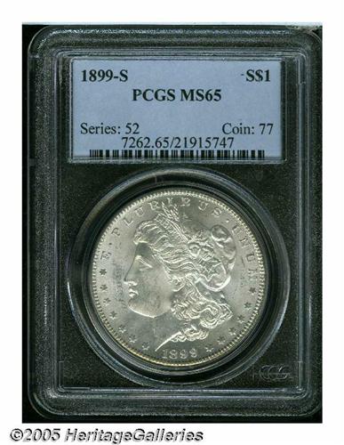 <B>1899-S<S$1> MS65 PCGS.</B></I> VAM-7. A Top 100 Variety. The 99 in the date is repunched northeast with a relatively wide spread. This lustrous Gem has a beautifully preserved reverse and no distracting obverse marks. The strike is good although not needle-sharp.