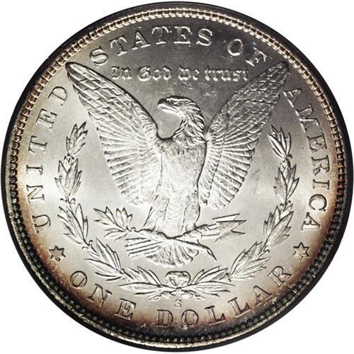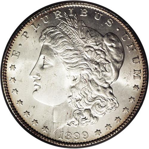 <B>1899-S<img border='0' src='http://www.heritagecoins.com/images/star.gif' width=10 height=10>$1> MS65 PCGS.</B></I> While available in the lower grades of Uncirculated, the 1899-S is scarce in Gem condition. This is a sharp, but not quite fully struck example that has a few small grease stains on Liberty's cheek that were present when the coin was struck. Excellent luster characteristics, as always, both sides are mostly brilliant with just the slightest hint of golden-brown patina at the margins. <BR><BR><B>Important notice:</B> Heritage usually auctions material at the rate of 200-250 lots per hour. On some occasions eBay Live bid software or the Internet may not be able to keep up with the pace of the auction. We recommend placing a realistic absentee bid now as insurance to avoid disappointment. Occasionally the auctioneer may eliminate or reject an eBay Live bid, and the auctioneer may also reopen a lot after the close of the eBay live bidding (usually because we missed an audience bid), and may reject your bid even if it shows you as the winning bidder. By bidding via eBay Live, you agree that Heritage may award the lot to another bidder at its sole discretion under the circumstances described above or any other reasonable circumstances. Since eBay bids are not shown to us until we open the lot on the floor, we treat those bids just like floor bids. In most cases the floor responds before the eBay bid is presented to us, due to Internet lag time, so for consistency we have made it a policy that floor bids are always considered first over tie eBay live bids. Also please note that all Heritage lots purchased through eBay Live carry a 20% Buyer's Premium. Please make sure you read the Terms and Conditions before you bid. This lot is being auctioned in conjunction with a live floor auction by Heritage Galleries & Auctioneers. All final auction and invoice information will be supplied by Heritage Galleries & Auctioneers, and all other information should be considered preliminary. Lot:3738 <BR><BR><B>Winning Notification and Billing:</B> After the FINAL session in this auction is complete, Heritage will send e-mail and snail mail invoices. This process normally takes several days. All final auction and invoice information will be supplied by Heritage Galleries & Auctioneers, and all other information should be considered preliminary. <BR><BR>This auction will be conducted on a live auction floor and over the Internet through eBay Live. If you choose to place an absentee bid, please take a moment to <font color='#0000ff'><u><a href='http://pages.ebay.com/liveauctions/help/before/laabsentee.html'>learn how eBay Live absentee bidding works</a></u></font><font color='#000000'>