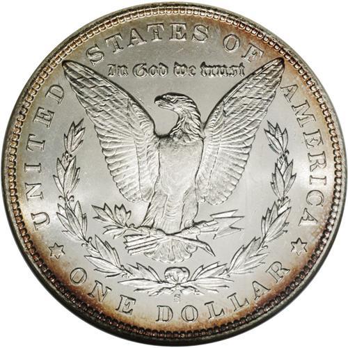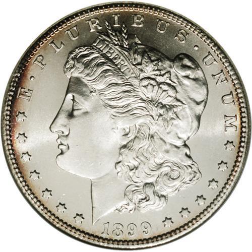 <B>1899-S<img border='0' src='http://www.heritagecoins.com/images/star.gif' width=10 height=10>$1> MS66 NGC.</B></I> Although it is not labeled as such, we believe that this lovely Premium Gem should be called a prooflike example. The fields are exceptionally well mirrored with reflective silver luster. A hint of gold color is visible around the edges on each side.