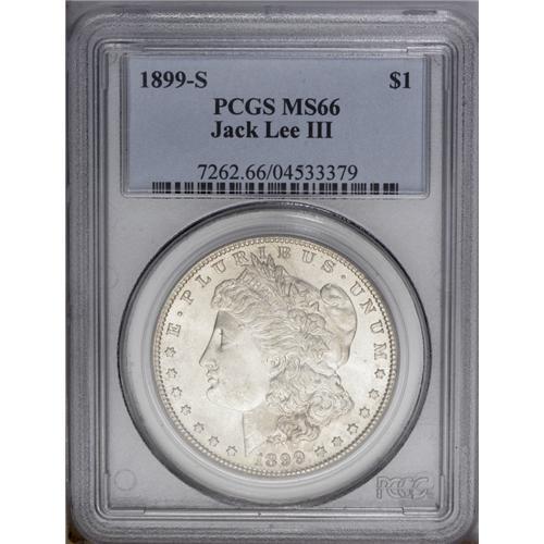 <B>1899-S<img border='0' src='http://www.heritagecoins.com/images/star.gif' width=10 height=10>$1> MS66 PCGS.</B></I> Ex: Jack Lee III. Light tan shades endow this lustrous Premium Gem, and a blush of steel-gray toning is noted on the lower left reverse. Sharply struck overall, with only a strand or two in the hair above the ear not absolutely defined. An attractively preserved example of this better date Morgan Dollar. Population: 84 in 66, 8 finer (1/06).<BR><I>From The Michael Casper Collection, Part Three.</B></I>