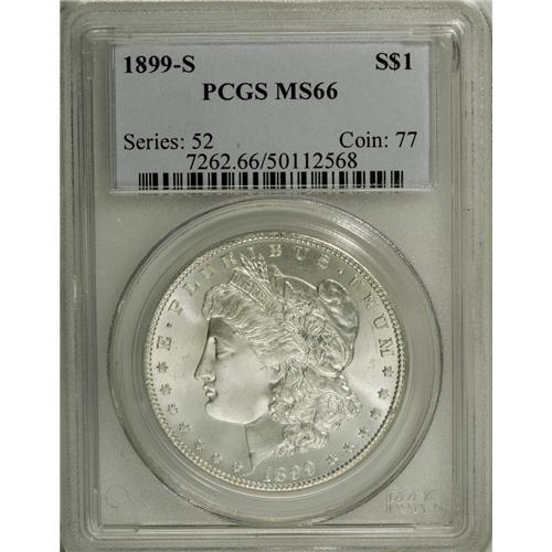 <B>1899-S S$1 MS66 PCGS.</B></I> The 1899-S is well known as a Redfield hoard issue. But we would be very surprised if a coin of this caliber came from the Redfield holdings. As the grade indicates, the surfaces are extraordinarily clean. Also brilliant overall, the striking details are generally well defined but not quite complete. Simple outstanding quality and sure to be the object of intense demand by dollar specialists. Population: 85 in 66, 8 finer (12/06).<BR><BR><b>Shipping:</b> Coin/Currency (<a target="_blank" href="http://www.heritageauctions.com/common/shipping.php">view shipping information</a>)