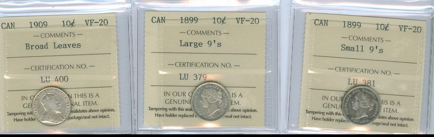 1899 Sm.9's, 1899 Lg.9's and 1909 Br. Lvs. Lot of 3 ICCS graded 10¢ coins, all VF20.