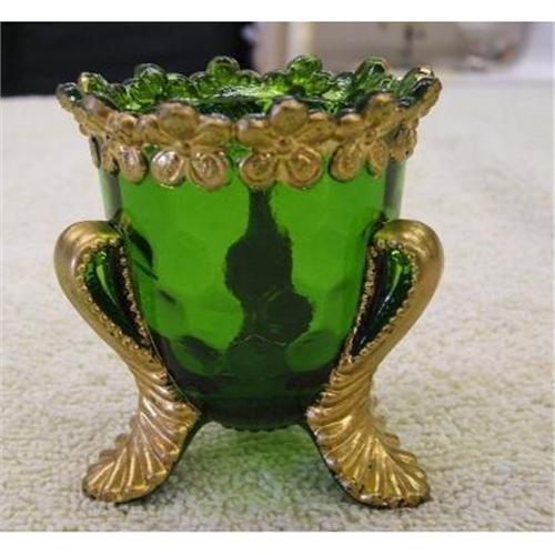 This is a beauty of a toothpick holder. It was made in 1899 by US Glass. Vermont or Aka Vermont Honeycomb is a beautiful emerald green with a honeycomb design and gold trim. It is in excellent condition and has almost no gold wear. It is 2 1/2" tall.