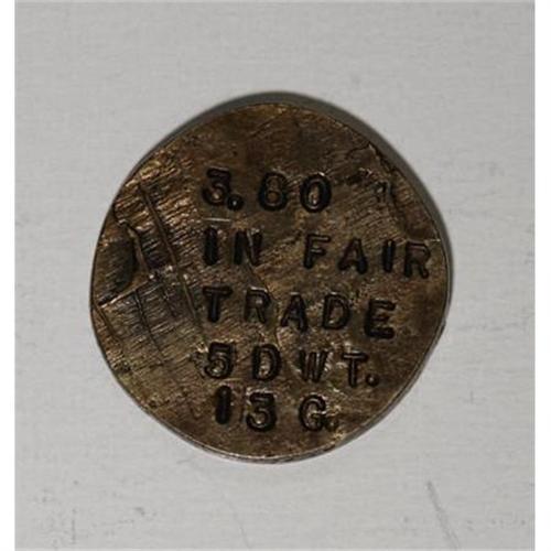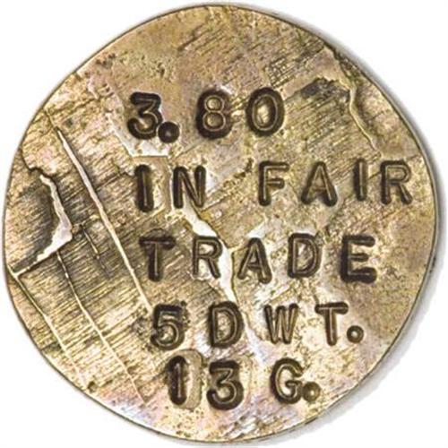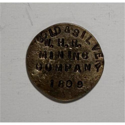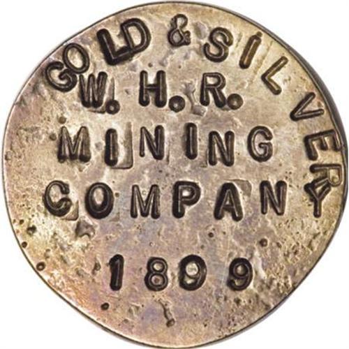 <B>1899 W.H.R. MS Mining Company Gold Button. 3.5 Ounces.</B></I> 22 mm. Believed to have a Colorado connection, this piece is subject to ongoing research. The obverse reads: GOLD & SILVER / W.H.R. / MINING /COMPANY / 1899. The reverse reads: 3.80 / IN FAIR / TRADE / 5 DWT. / 13 G. Irregular surfaces with deep brown-tinted toning.<BR><BR><b>Shipping:</b> Coins & Currency (<a target="_blank" href="http://www.heritageauctions.com/common/shipping.php">view shipping information</a>)