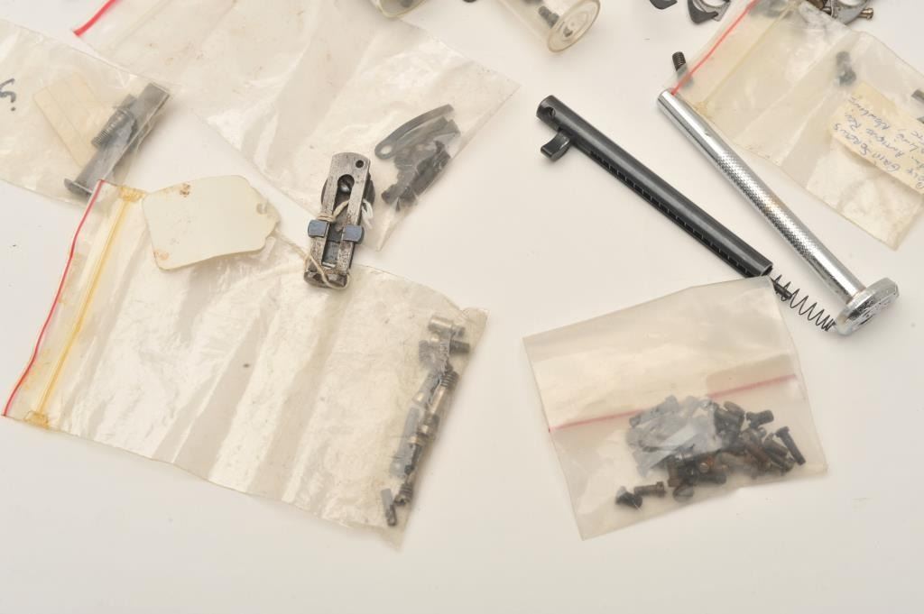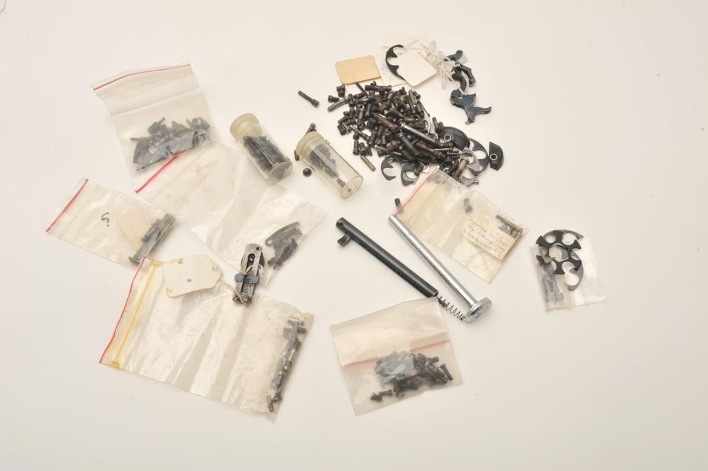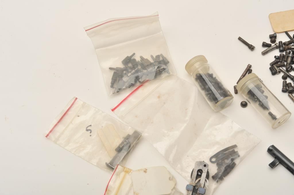 Lot of early Colt small parts and some other makers; screws, ejector rod and housing, several triggers for Colt New Line revolvers, a Colt Express carbine rear sight, grip grommets, etc. Est.: $100-$200.