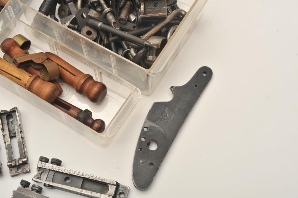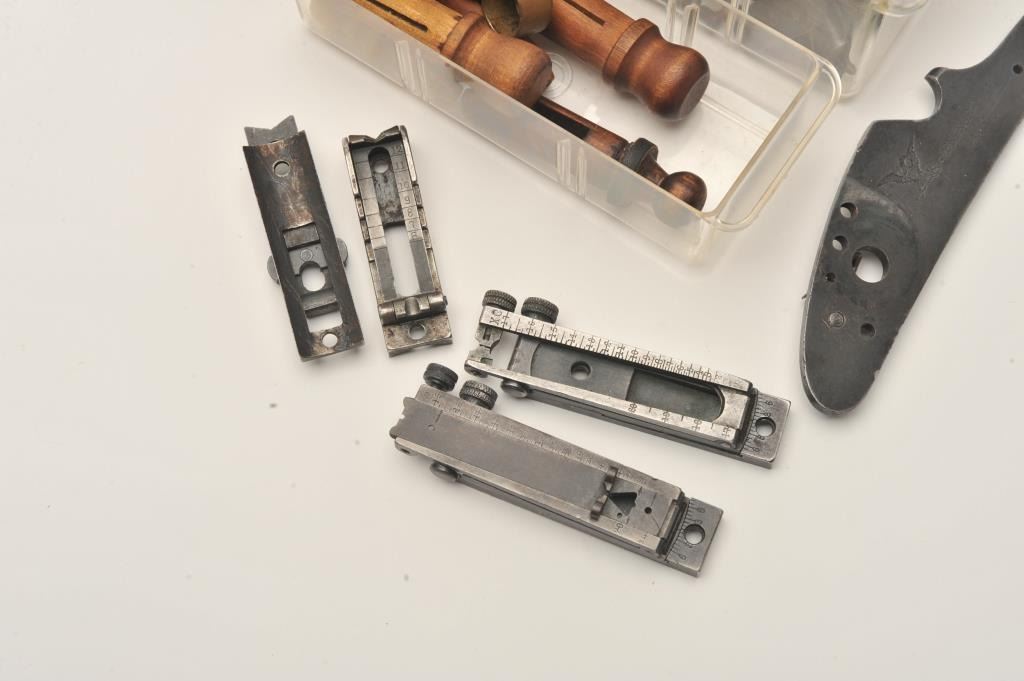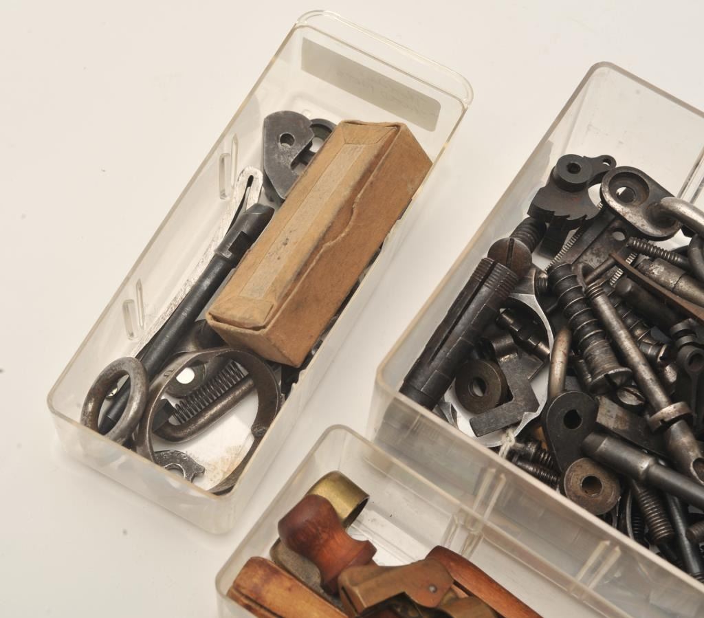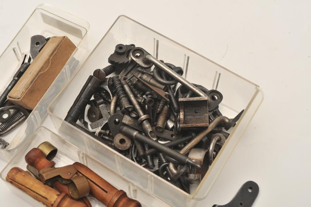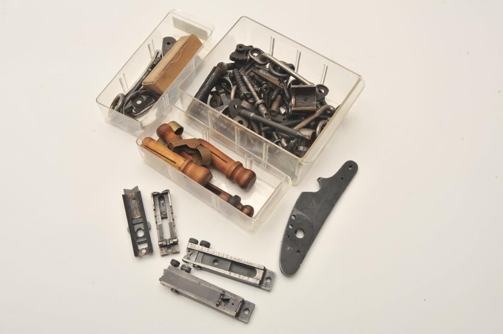 Lot of old Trapdoor Springfield/Krag rifle small parts including sights, extractors, barrel band, lockplate, saddle rings/bases, screws, springs, Krag brass barrel covers, etc. Est.: $150-$300.