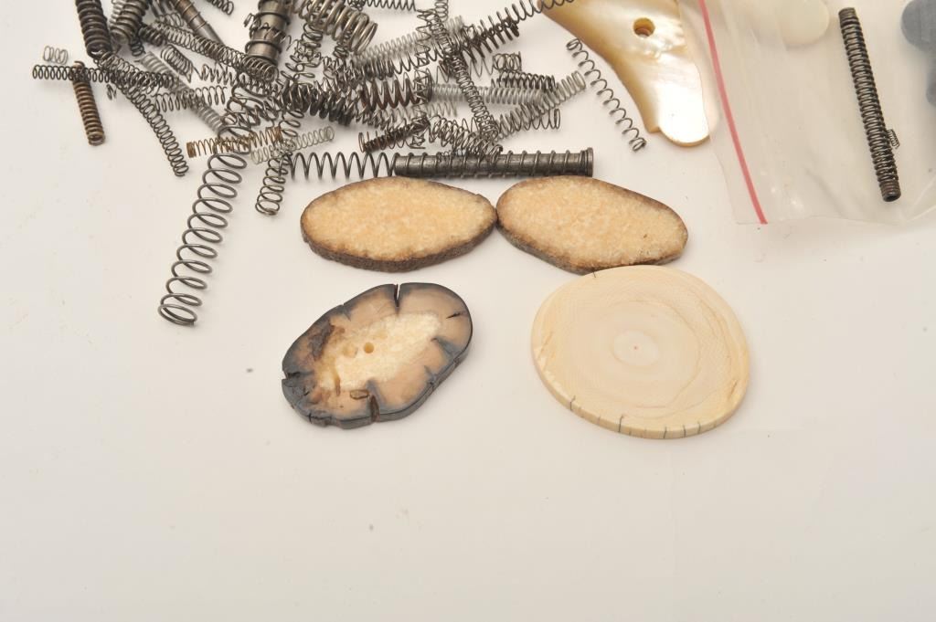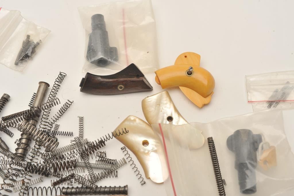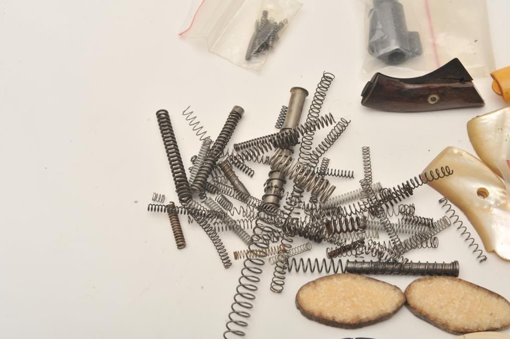 Lot of misc. gun springs and parts, grips, etc. plus 2 S&W revolver barrels. Est.: $100-$150.