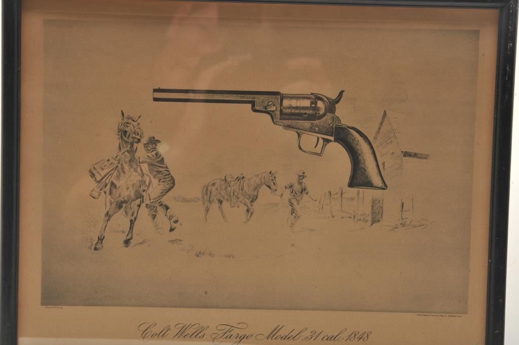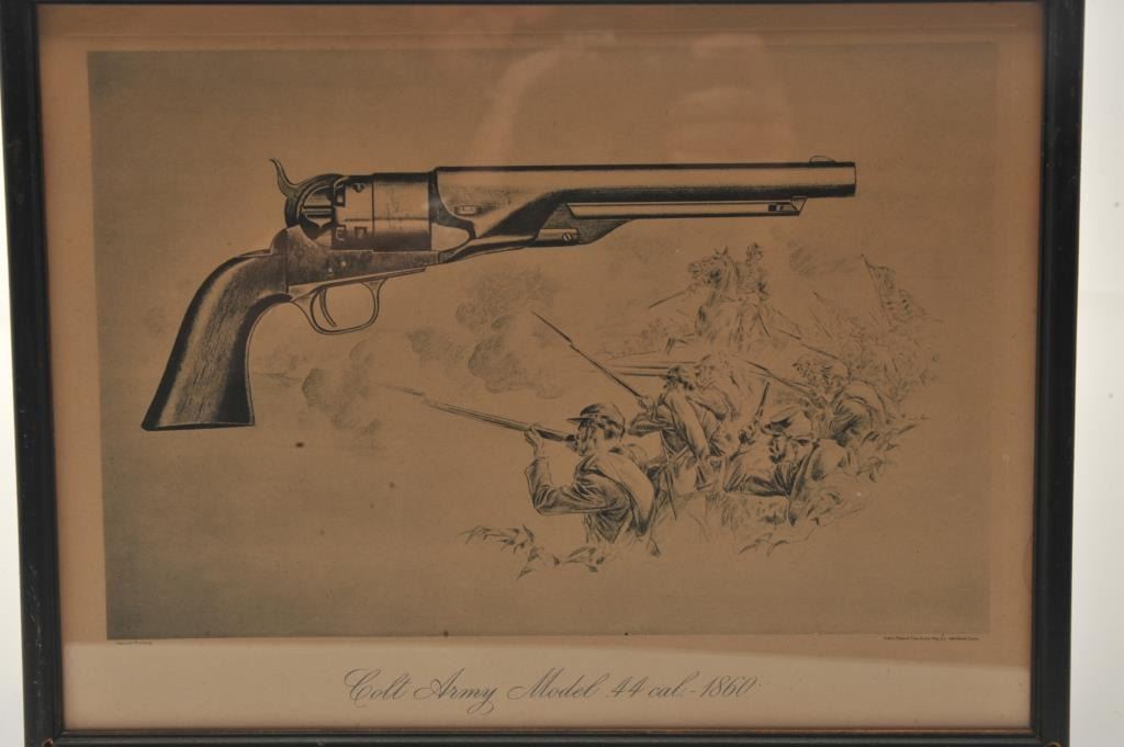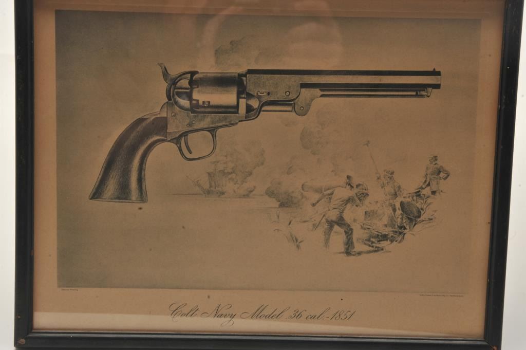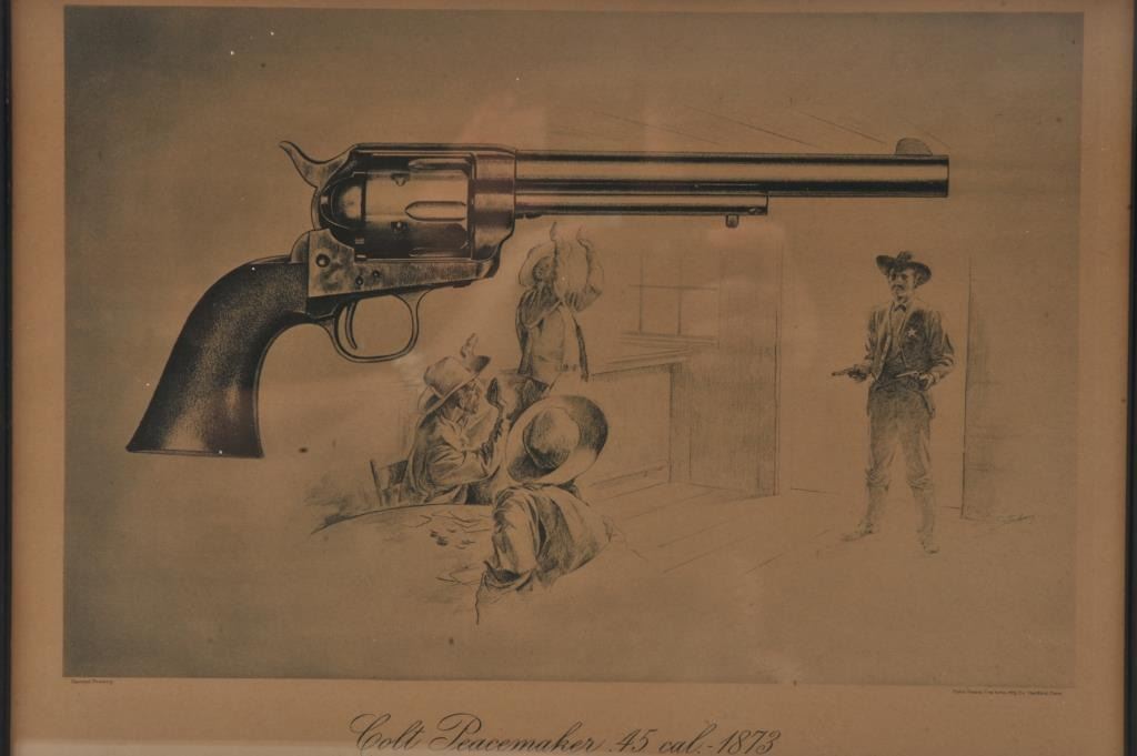 Lot of 4 framed prints of Colt firearms released in the 1950’s-60’s by famed Southern California gun dealer Jim Serven. Each is approximately 9.5” x 12.5” overall and includes a Colt Model 1851 Navy revolver, aColt Model 1860 Army revolver, a Colt Wells Fargo Model revolver and the classic Colt Single Action Army “Peacemaker” revolver. Great decoration for the gun room or office. Est.: $50-$100.