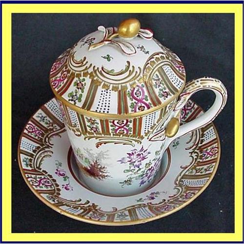 Handpainted cup / can and saucer with lid. Often considered to have been used to drink chocolate. Made in Rouen, France during the 18th century. <BR>Diameter of saucer is 6 1/2inches. Cup is 4 inches high, excluding the lid, and top diameter of cup is over 3 1/2inches.<BR>All 3 pieces are profusely decorated in puce, blue, burnt-orange and green with a lot of gold as an integral part of the patterns and as highlights. Flowers or organic patterns within columns surround the perimeter of each piece. Within are sprigs of flowers of various sizes, gold scrolls and sunbursts. In front of the cup is a handpainted landscape scene with 18th century courtiers greeting each other, water, parks and mountains in the background. The handle is naturalistically modelled as a stem, ending in a 3-dimentional cluster of foliage and berries. Similar applied decoration on the lid. Richly gilded berries. <BR>Marked underneath with a red fleur-de-lis over a P. Mark used in Rouen, 16th-18th century. The fleur-de-lis is usually associated with the Bourbon kings of France and the cup may have been commissioned for him.<BR>There is also an impressed anchor.<BR>Condition of all 3 pieces is excellent. No chips/cracks/damage to be found, although the cup does have light crazing.