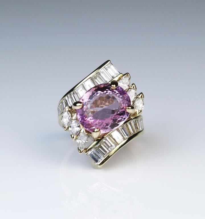 Exquisite Pink Tourmaline and Diamond ring heirloom quality featuring a fine intense Pink Tourmaline weighing approx. 10.00-12.00 carats surrounded by 25 of the finest baguette and marquise cut Diamonds weighingapprox. 3.50-4.00 carats total with F-G colors and VS clarity set in a 14 karat yellow gold custom made setting. Full Retail Appraisal at $20,000. Estimates $8,000-$12,000