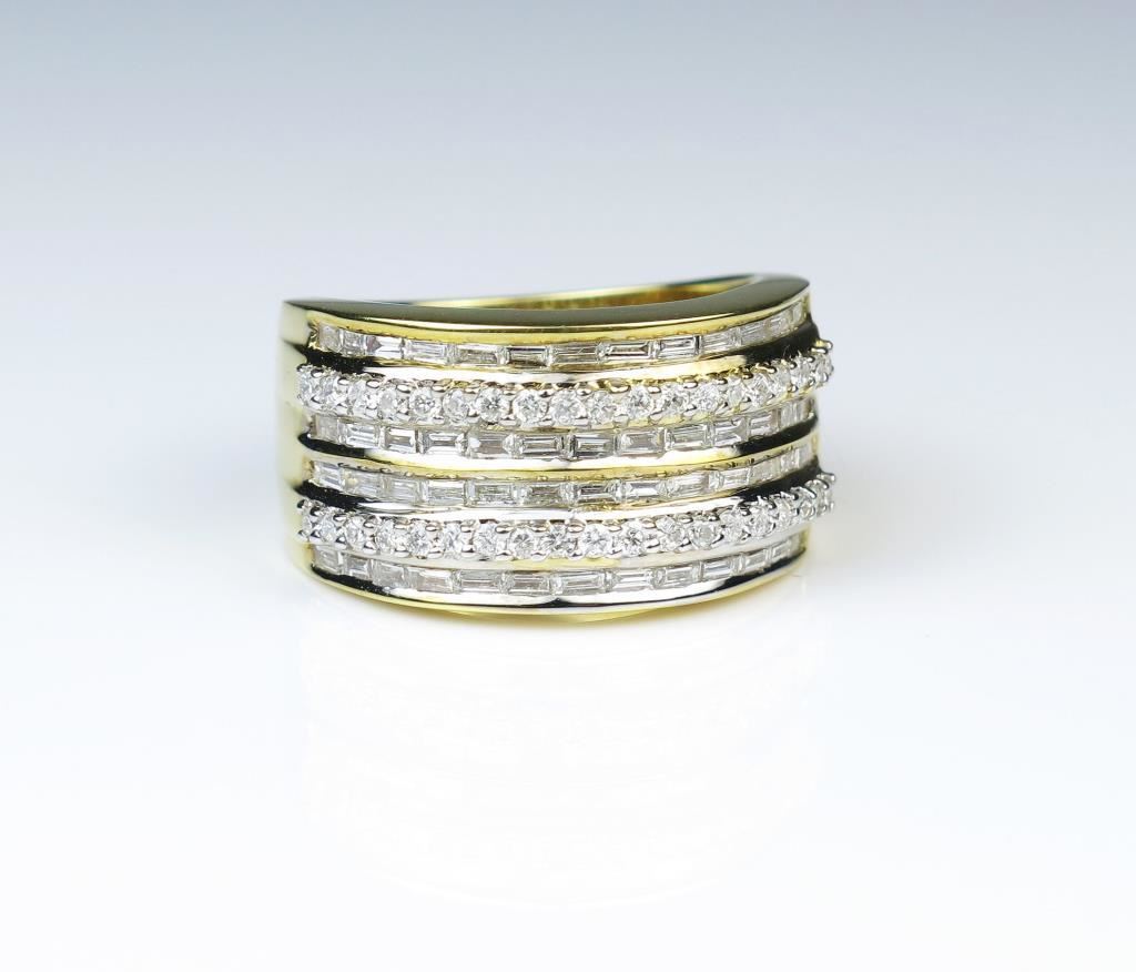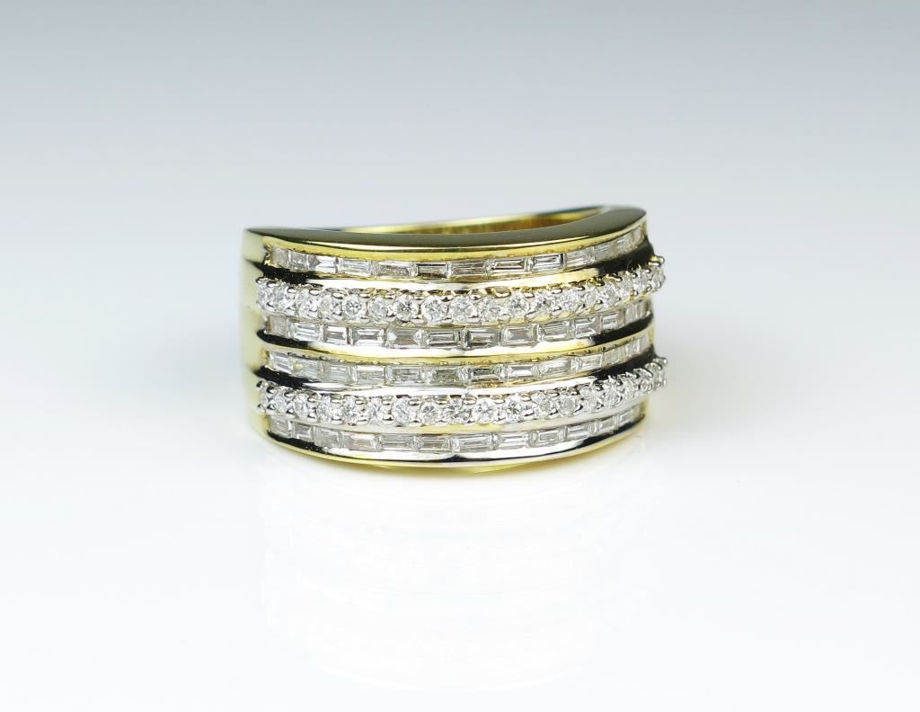 Dazzling Wide Diamond Band featuring approx. 3.00 carats of Diamonds with a combination of round and baguette cuts with F-G colors and VS/SI clarity set in 14 karat yellow gold. Retail $4,000-$6,000 Estimate $2,000-$3,000