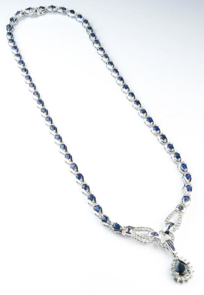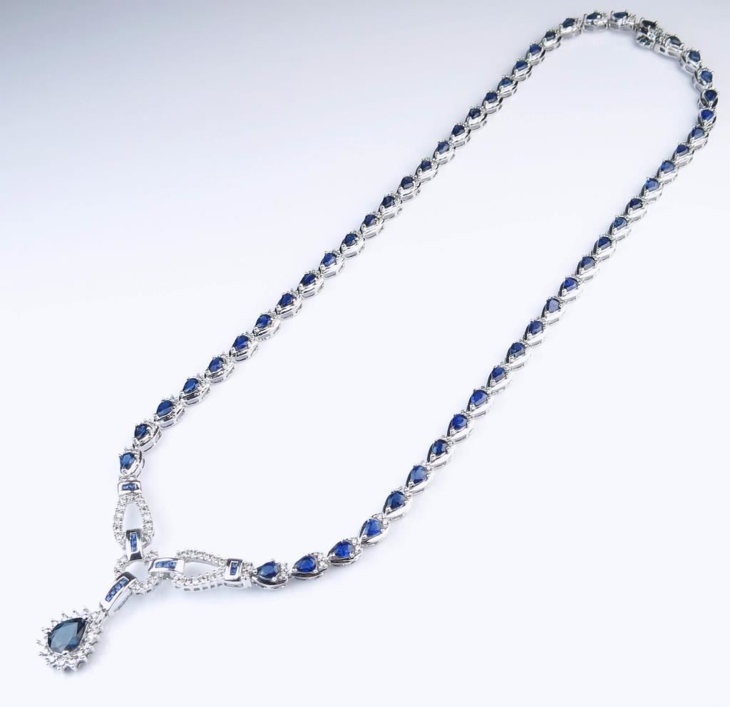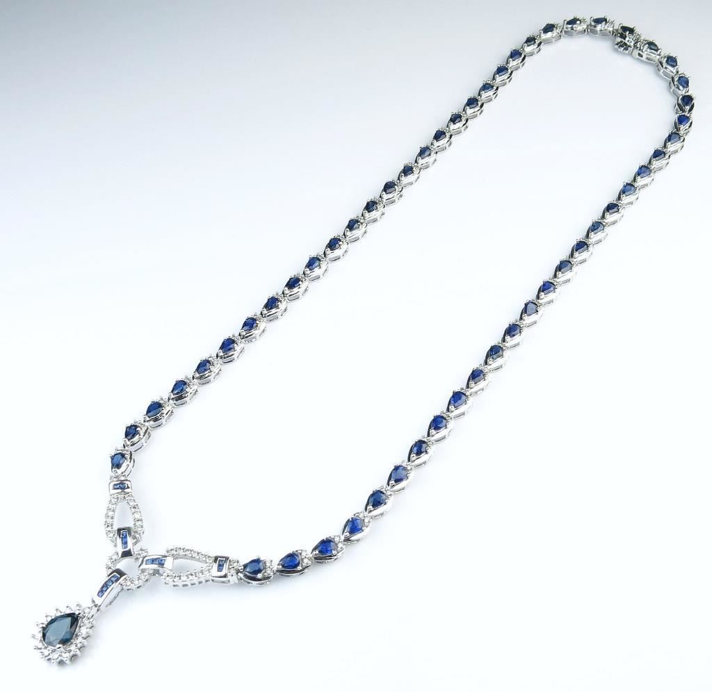 Spectacular Estate Blue Sapphire and Diamond Necklace featuring over 55 pear shape Sapphires and 14 channel set Sapphires with a combined total of approx. 9.00-10.00 carats accented with approx. 1.25 carats of round cut Diamonds with H-I colors and SI-I clarity set in an elegant 14 karat white gold setting. Gorgeous Luxury Piece In Like NEW Condition. Retail $12,000-$16,000 Estimate $5,000-$7,000