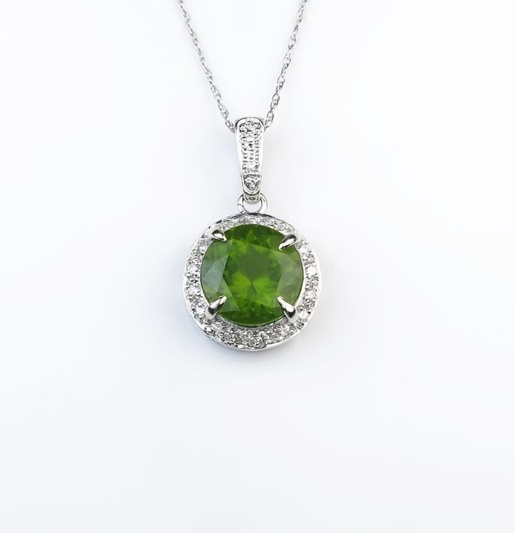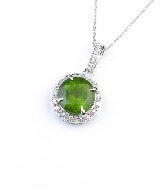 Captivating Peridot and Diamond pendant featuring a round 6.22 carat Peridot encircled with 18 full cut Diamonds weighing approx. 0.30 carats with F-G colors and VS/SI clarity set in lovely 14 karat white goldsetting. Retail $2,000-3,000 Estimates $1,400-$2,000