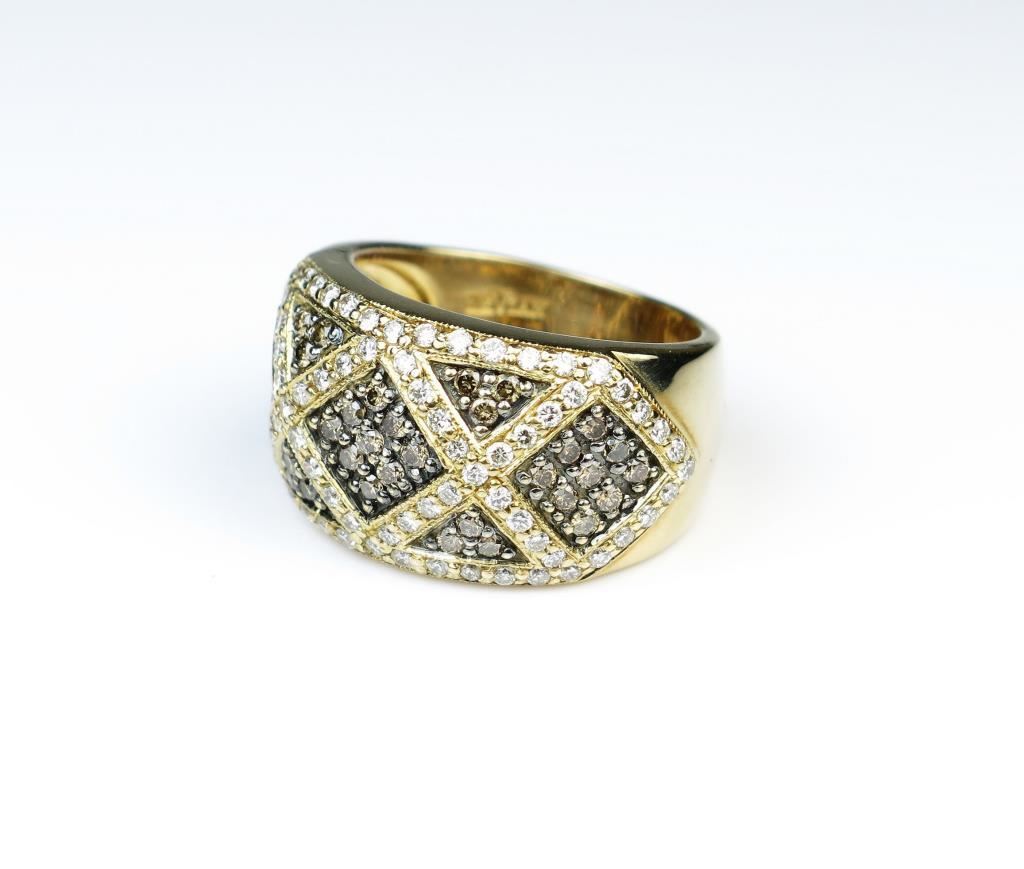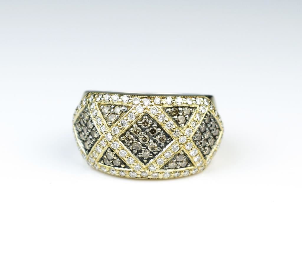 Elegant Levian White and Champagne Diamond Ring featuring 120 pave set Diamonds with 80 ‘IDEAL’ cut Diamonds with G-H colors and VS clarity accented with 40 champagne colored Diamonds high quality setting in 14 karat yellow gold. Retail $3,000-$4,000 Estimates $1,500-$2,000