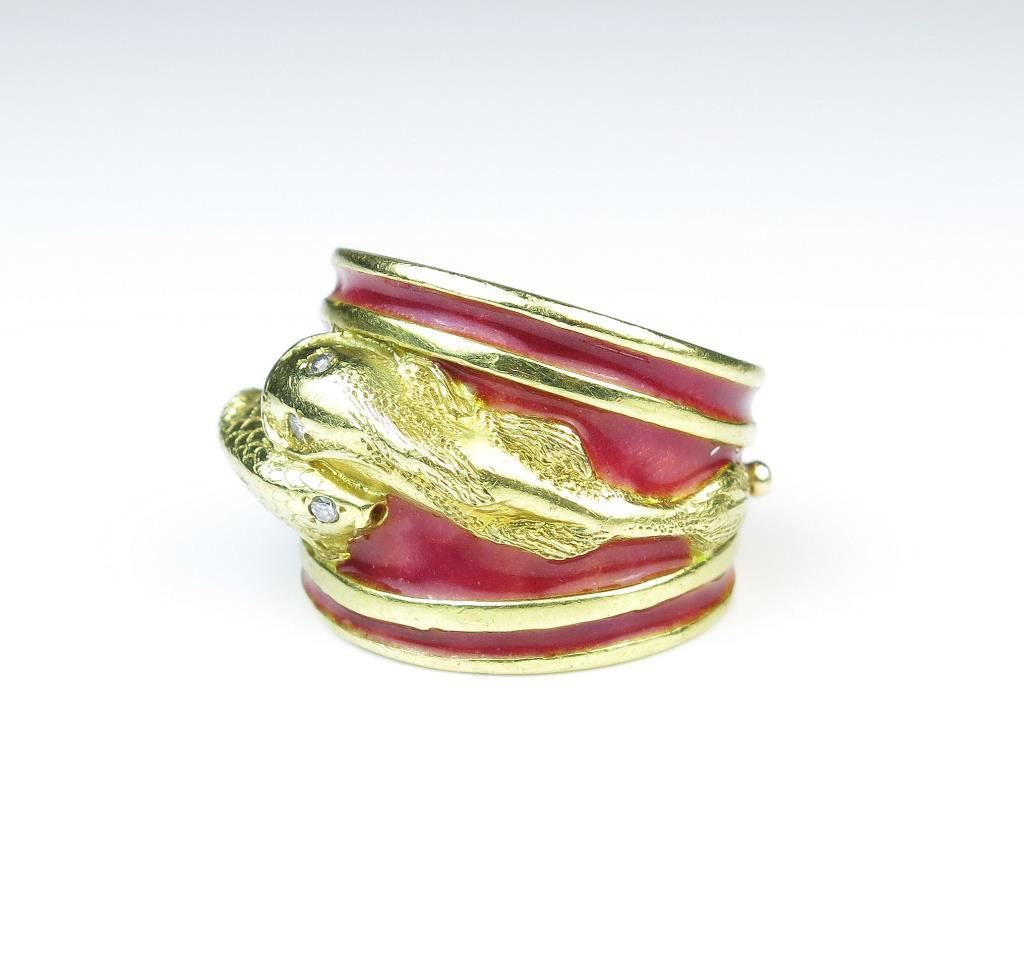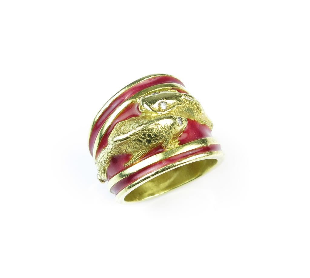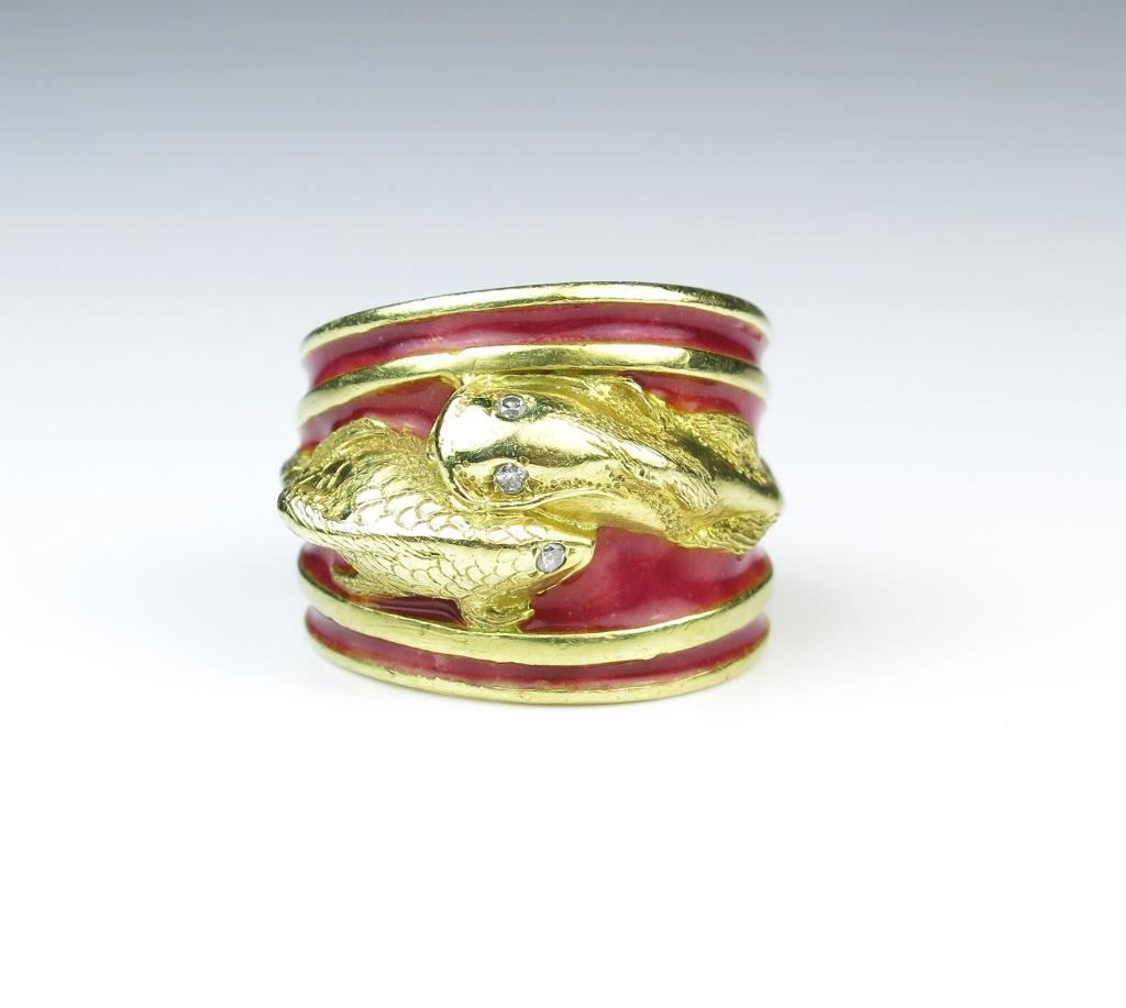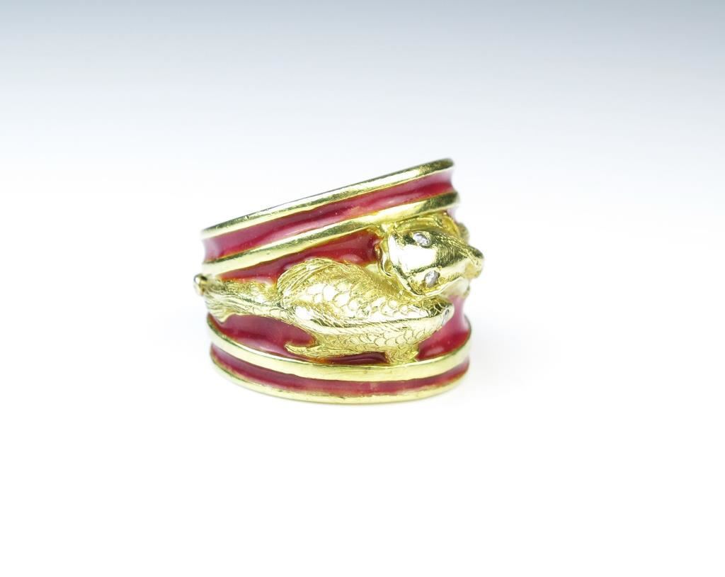 One of a Kind 18 karat Golden Fish Band featuring 2 beautifully hand carved fish set with fantastic detailing and Diamond eyes accented with red colored enamel. Amazing Connoisseur Piece with just under $1,000.00 in Gold Value alone. Retail $4,000-$5,000 Estimate $2,000-$3,000