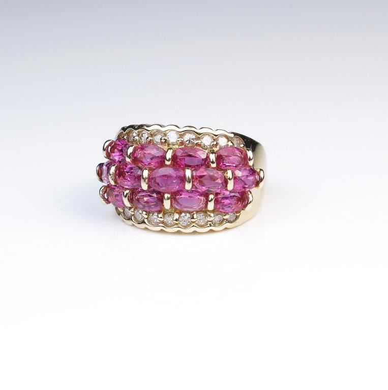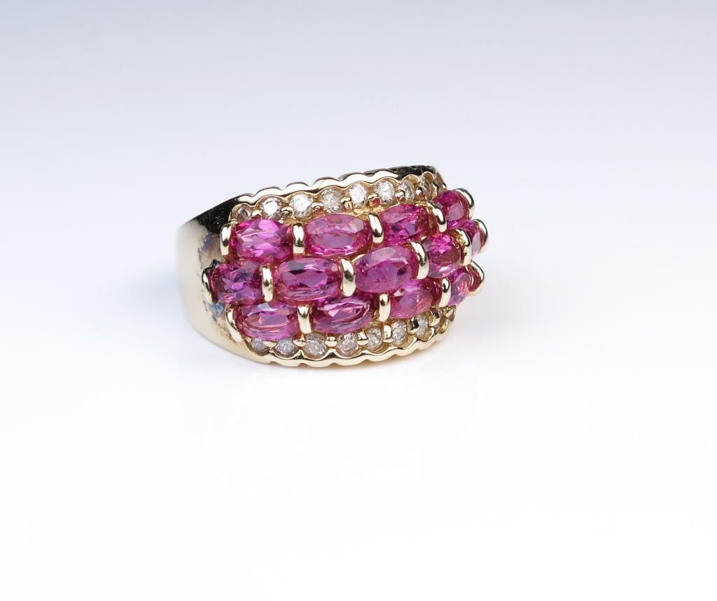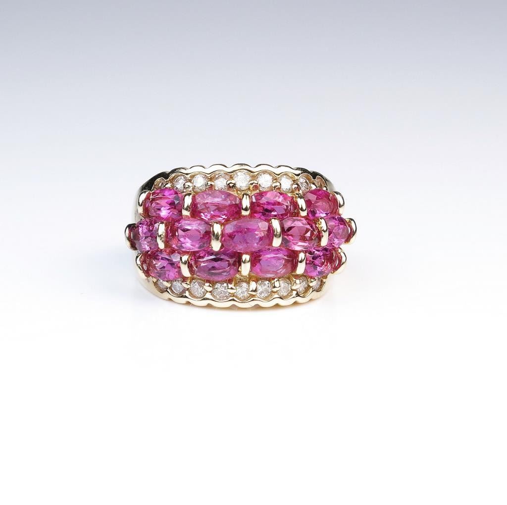 Stunning intense pink Tourmaline and Diamond ring featuring 13 intense pink Tourmalines weighing approx. 5.00 carats accented with 18 accent Diamonds weighing approx. 0.40 carats with G-H colors and SI clarity set in weavedesign setting of 14 karat yellow gold. Retail $3,000-$4,000 Estimates $1,500-$2,000