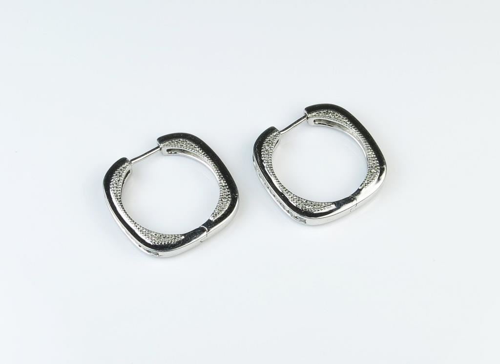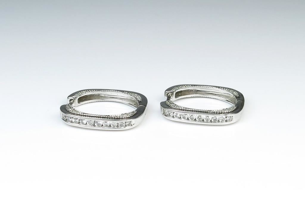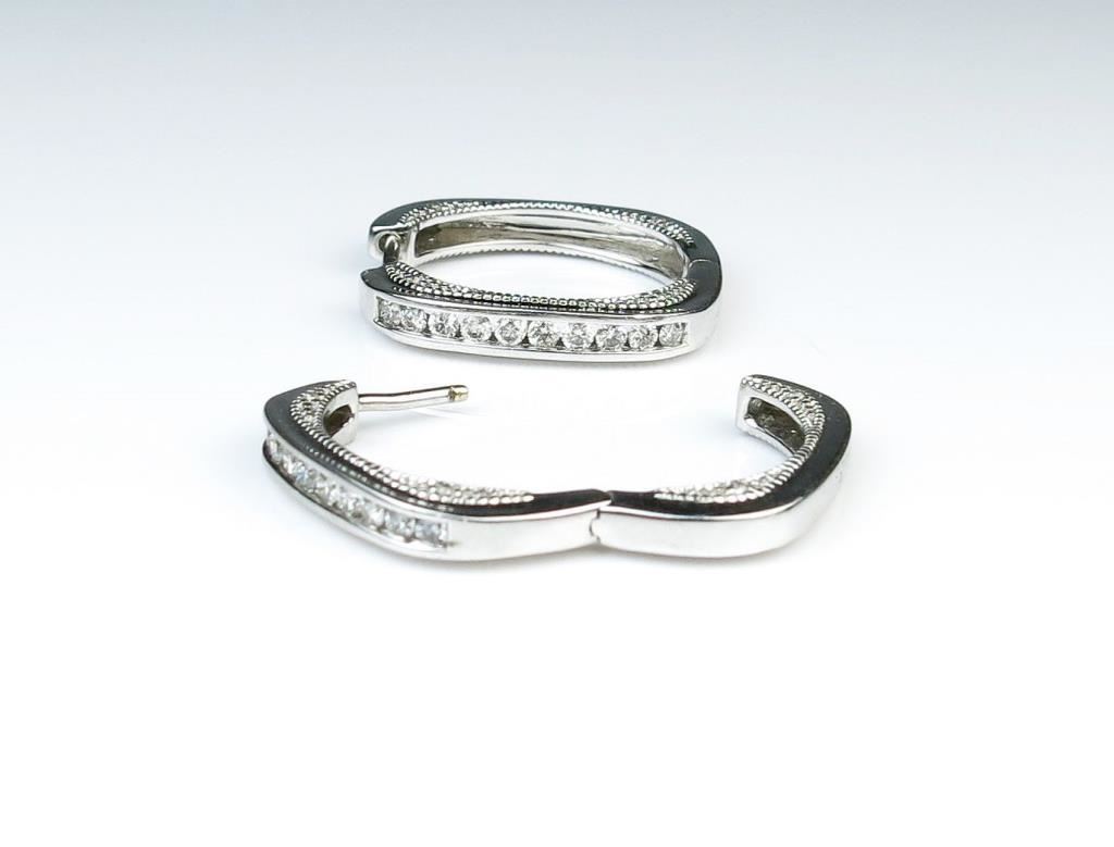 Stylish Diamond Hoop Earrings featuring 28 round cut channel set Diamonds weighing approx. 0.50 carat with G-H colors and VS clarity set in 14 karat white gold setting. Retail $2,000-$3,000 Estimates $1,000-$1,500