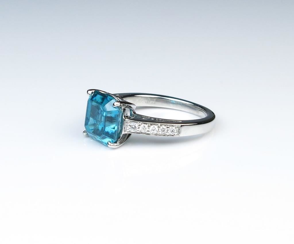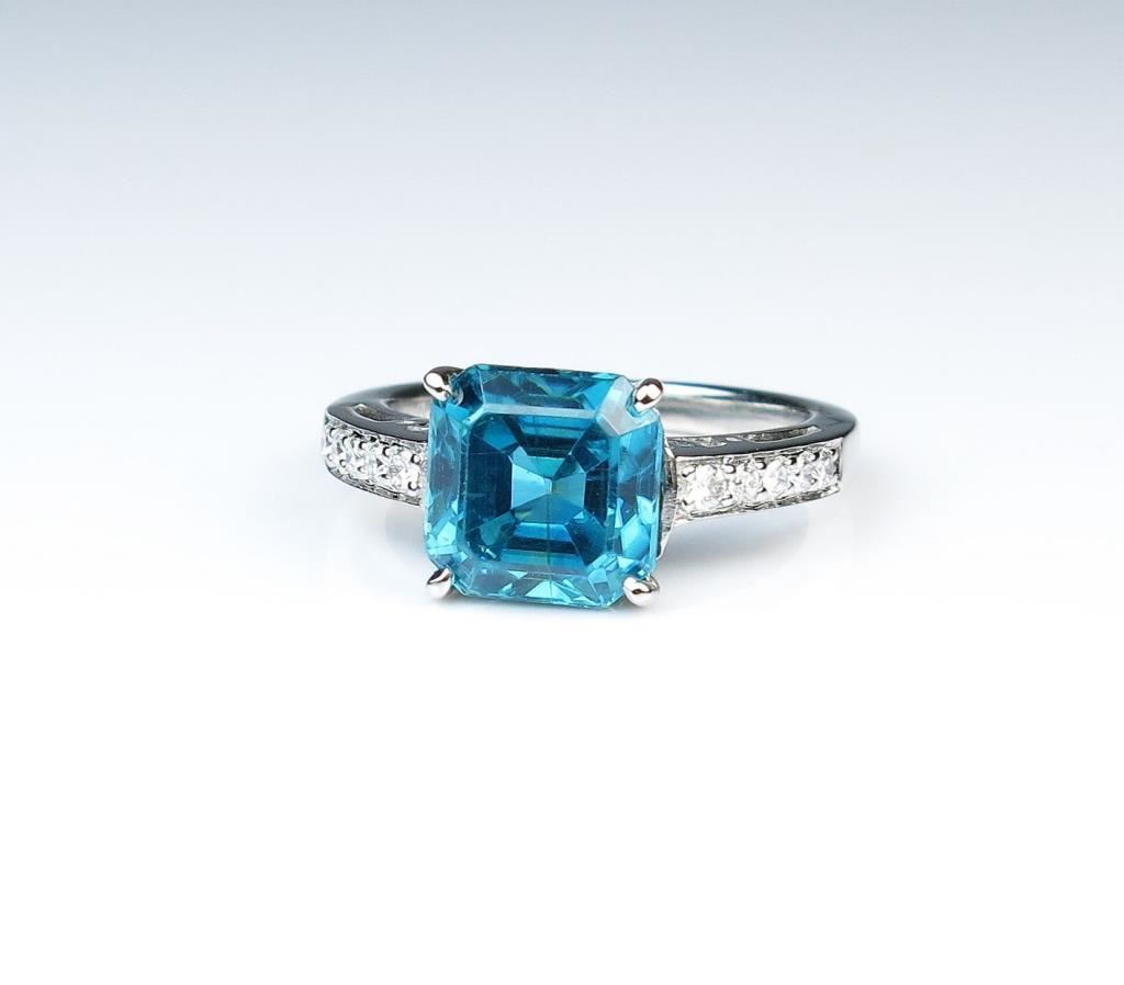 Lovely Blue Zircon and Diamond Ring featuring a Blue Zircon weighing 5.02 carats and 10 ‘IDEAL’ cut Diamonds weighing approx. 0.20 carats of F-G colors and VS clarity set in 14 karat white gold. Estimates $800-$1,200