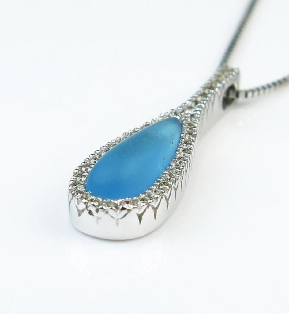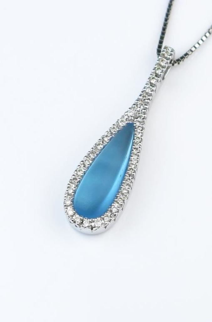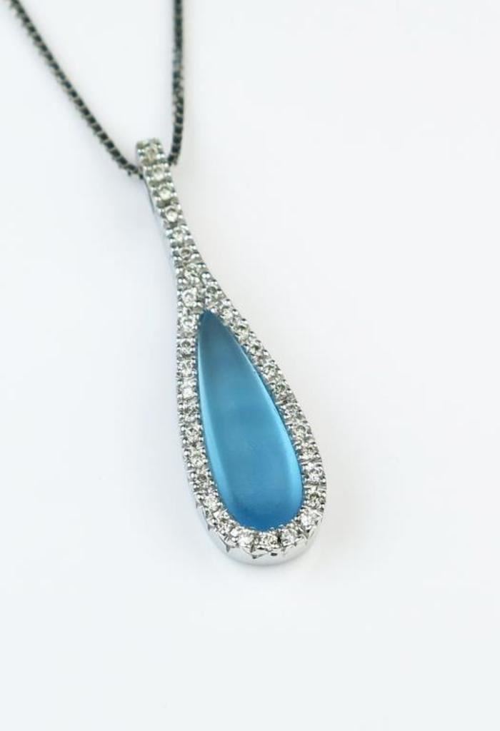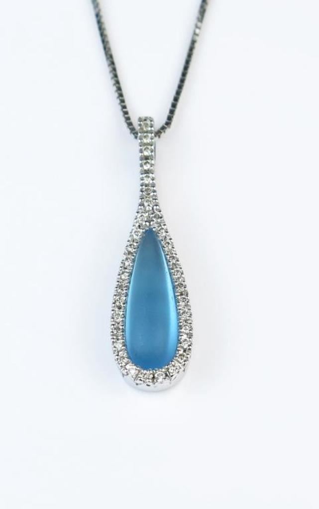 Charismatic 18 karat Italian Designer Aquamarine and Diamond Pendant featuring a pear shaped frosted cabochon Aquamarine framed with 33 round cut Diamonds weighing approx. 0.30 carats with G-H colors and VS clarity set in white gold setting. Retail $2,000-$3,000 Estimates $1,000-$1,500