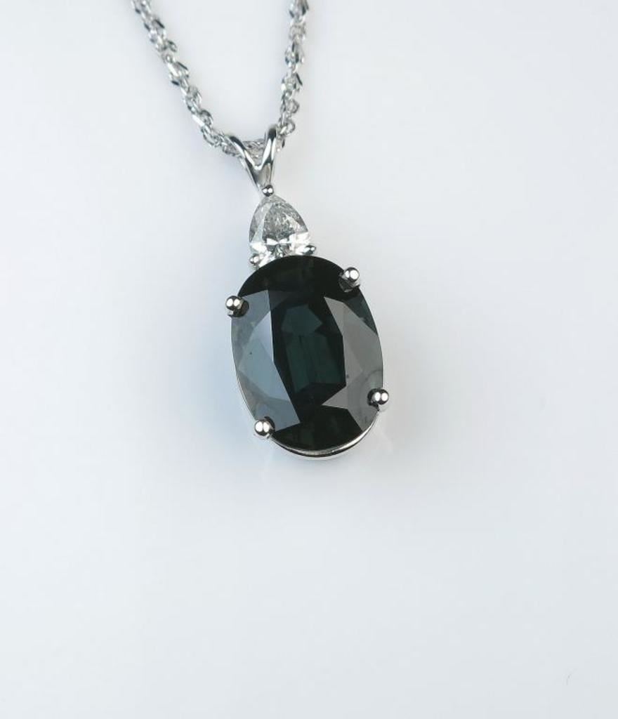 Spectacular AAA Quality 8.08 carat Green Sapphire and Diamond Pendant featuring a 100% Natural Sapphire with No Treatment VVS clarity and rich blue green color accented with a pear shaped Diamond weighing 0.33 carats with F-G colors and SI clarity set in 14 karat white gold setting. Full Appraisal Value $24,000.00 Estimate $8,000-$12,000