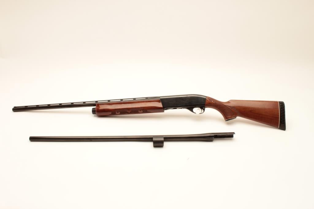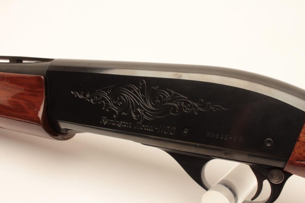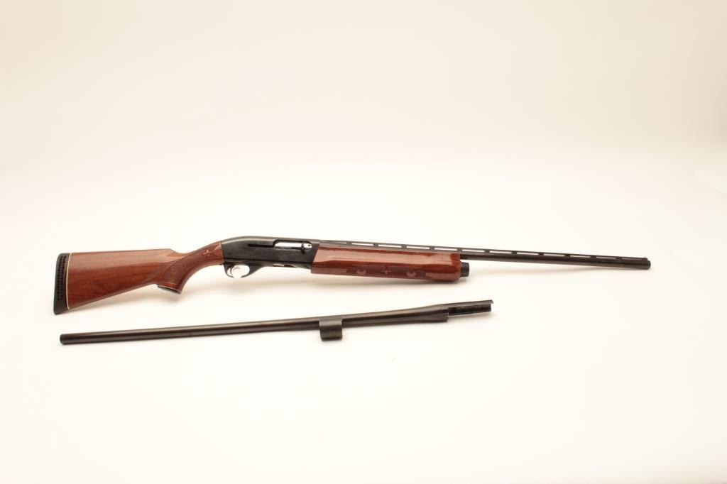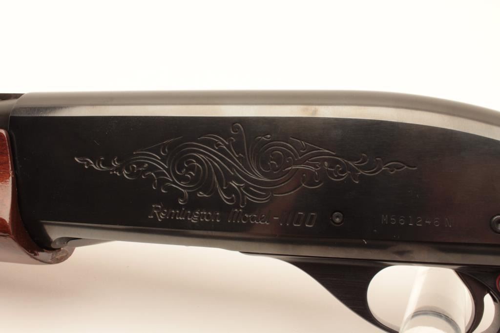 Remington Model 1100 Magnum semi-automatic shotgun, 20 gauge, Serial #M561246N. The shotgun is in very good to nearly fine overall condition with a 28” barrel with a steel bead front sight and full-length Lot Title ventilated rib. The barrel and receiver retain nearly all of their blue finish with only light handling marks noted. The checkered wood stocks are in very good condition with only minor handling marks. Lot Title The butt ends with a Remington marked ventilated rubber pad providing a 14” LOP. The lot includes an additional Remington barrel in the factory box. The bore is very good, the markings are sharp and the action Lot Title is crisp. Est.: $275-$550. (Modern).