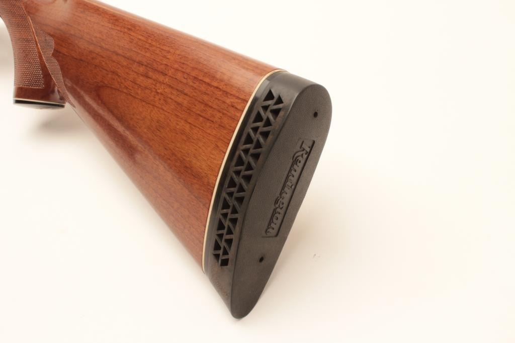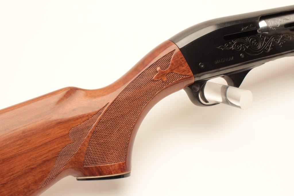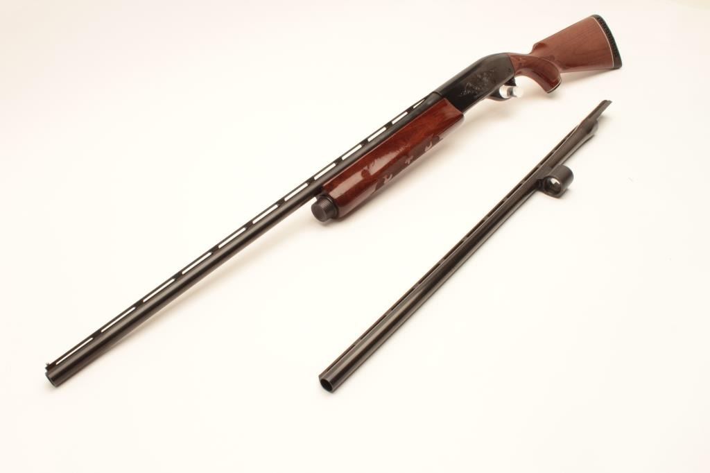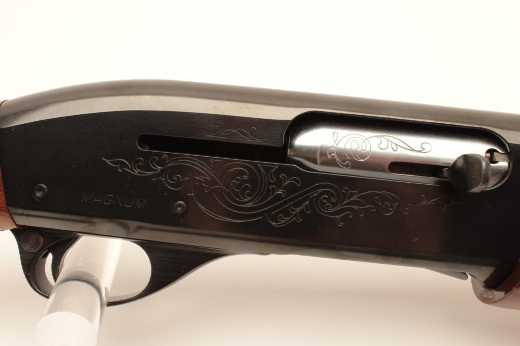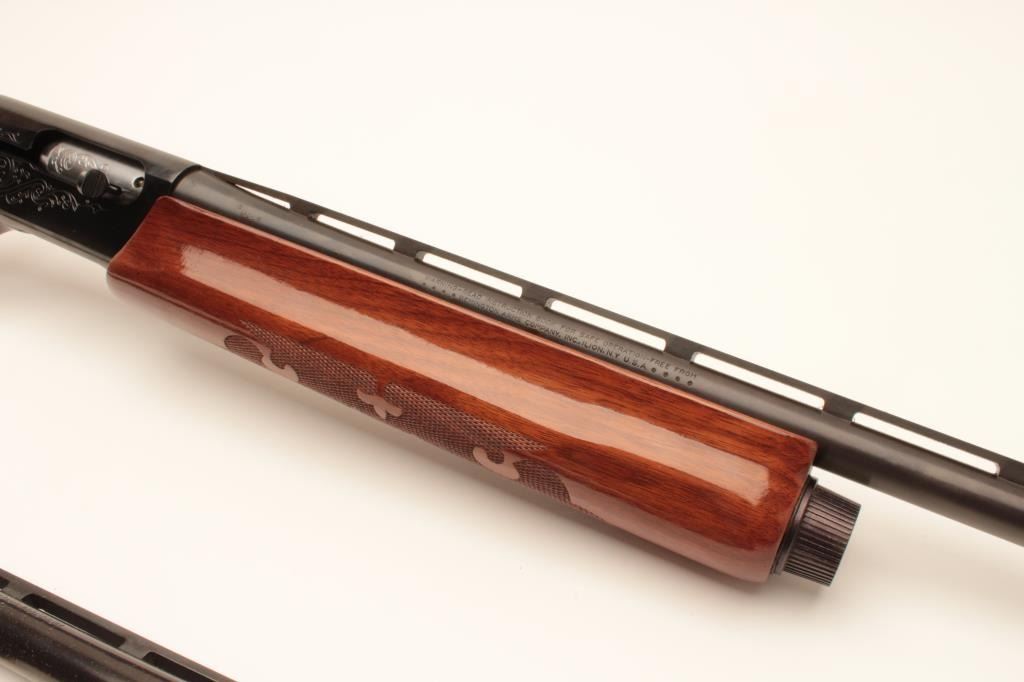 Remington Model 1100 Magnum semi-automatic shotgun, 20 gauge, Serial #M561246N. The shotgun is in very good to nearly fine overall condition with a 28” barrel with a steel bead front sight and full-length Lot Title ventilated rib. The barrel and receiver retain nearly all of their blue finish with only light handling marks noted. The checkered wood stocks are in very good condition with only minor handling marks. Lot Title The butt ends with a Remington marked ventilated rubber pad providing a 14” LOP. The lot includes an additional Remington barrel in the factory box. The bore is very good, the markings are sharp and the action Lot Title is crisp. Est.: $275-$550. (Modern).